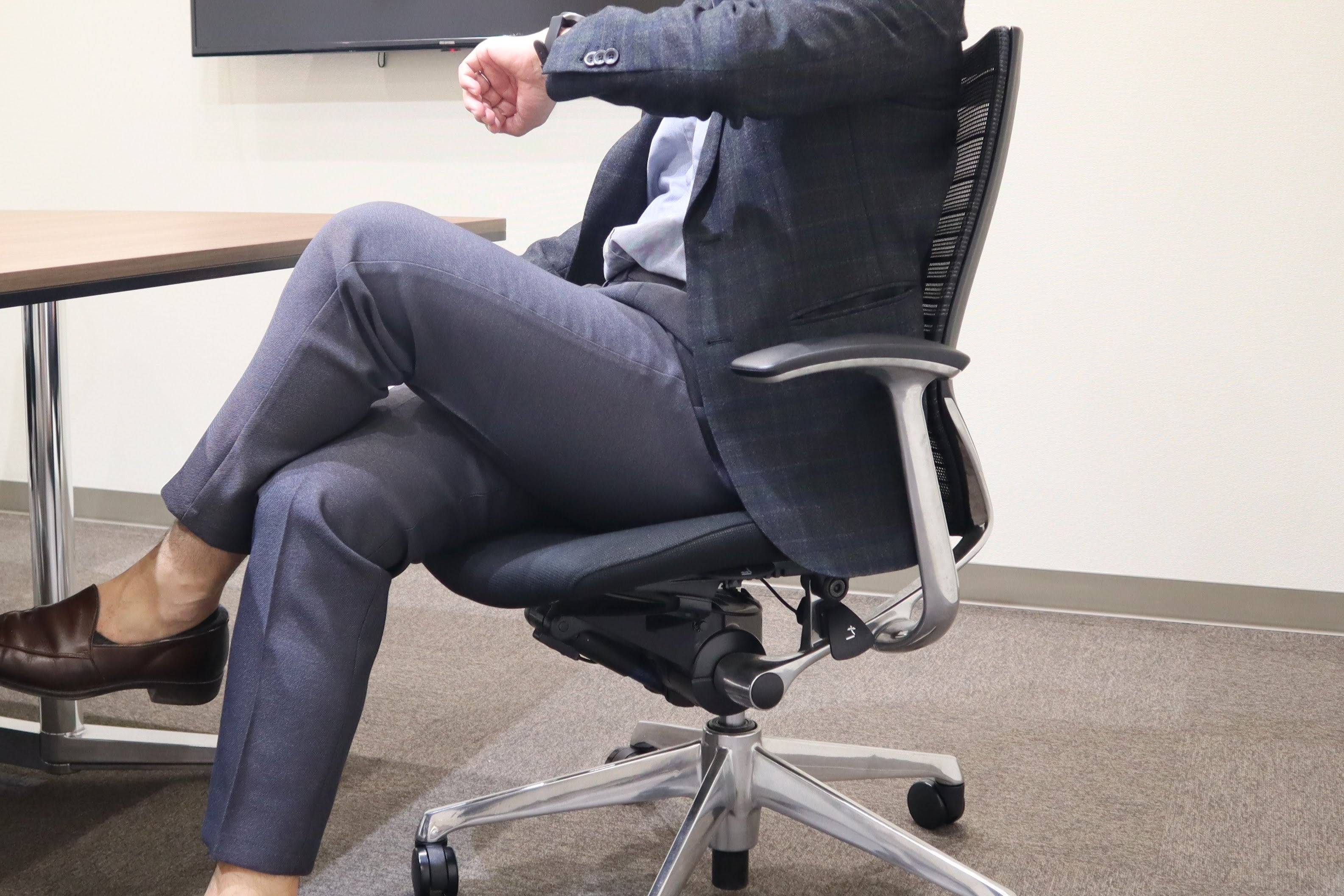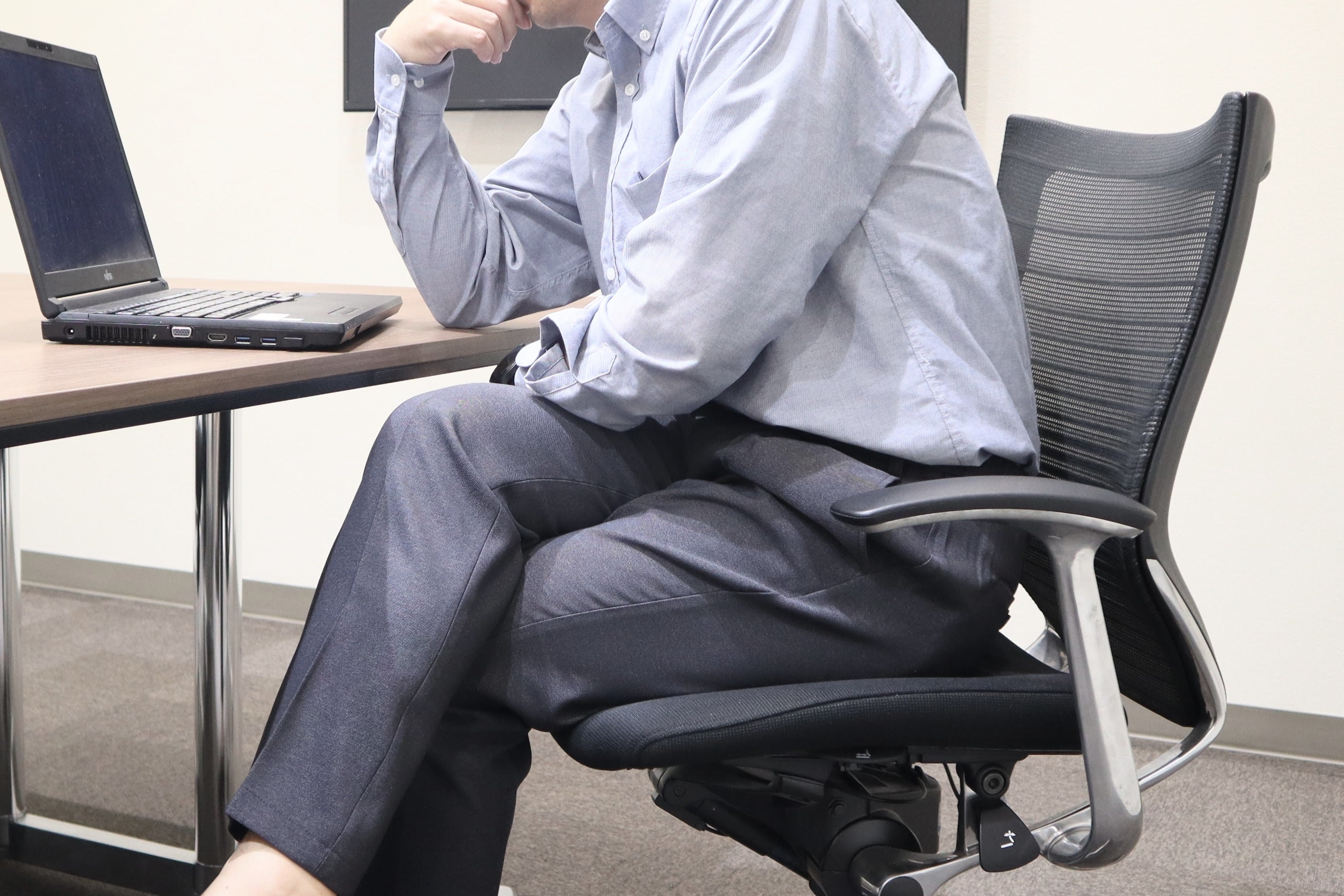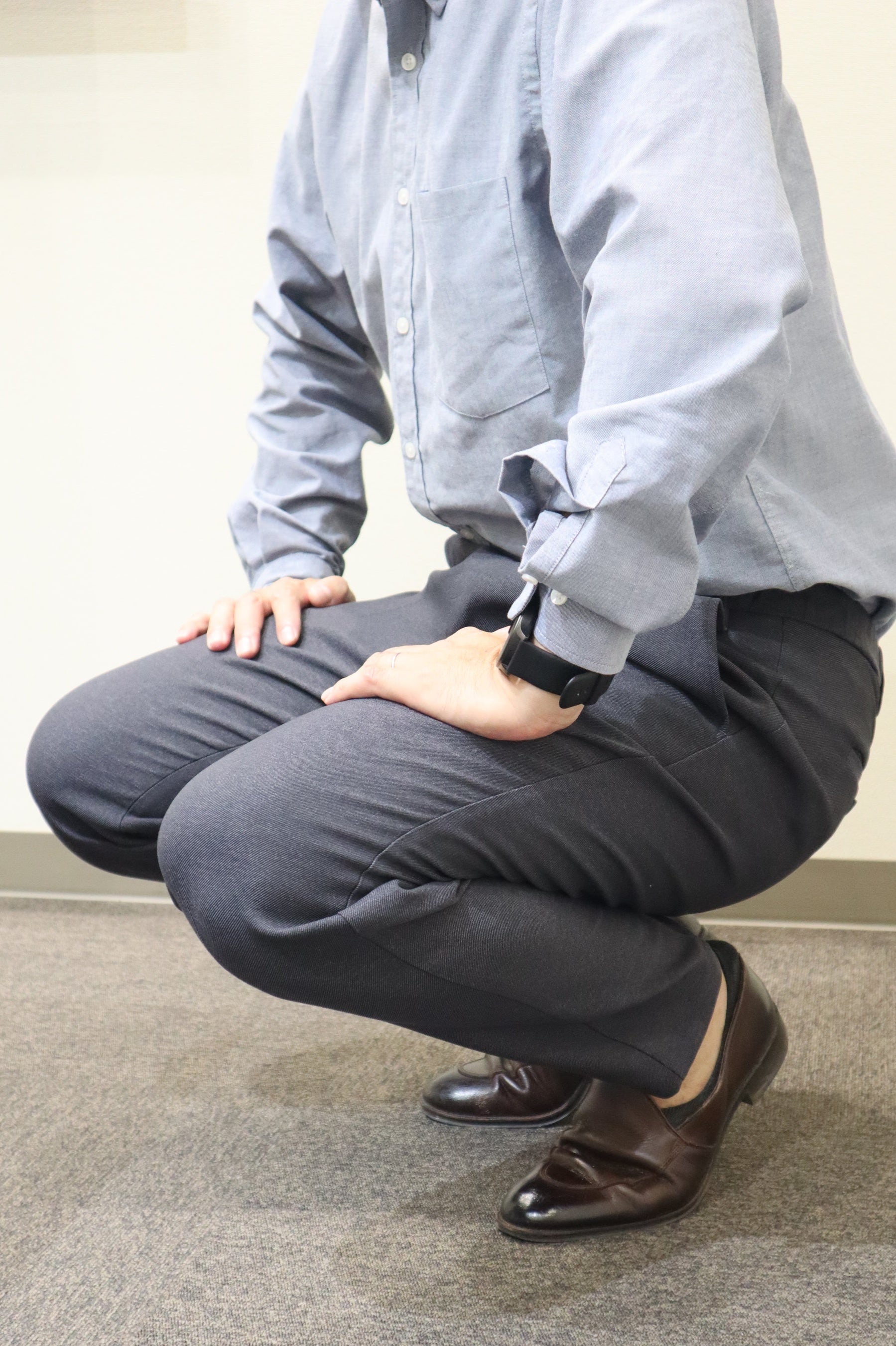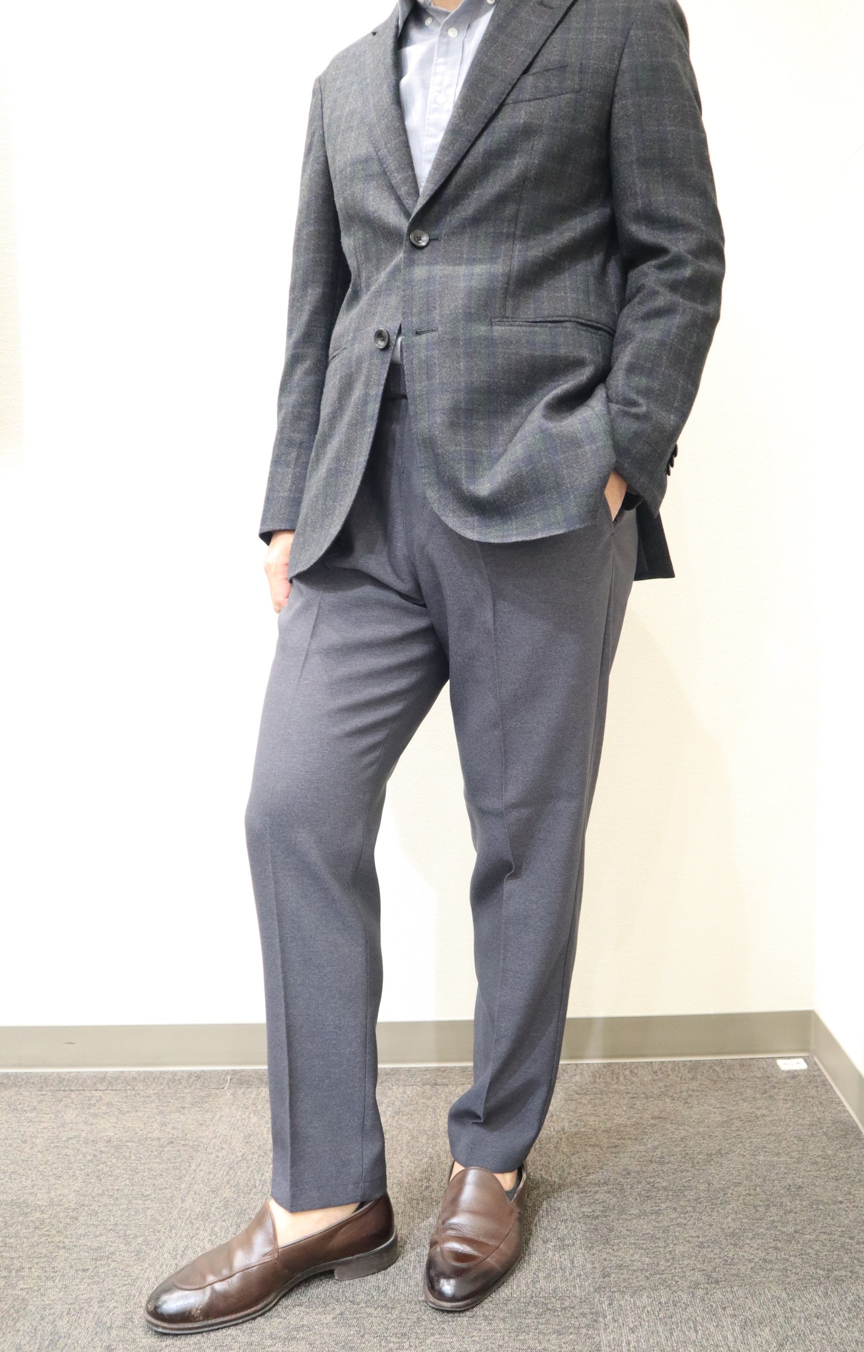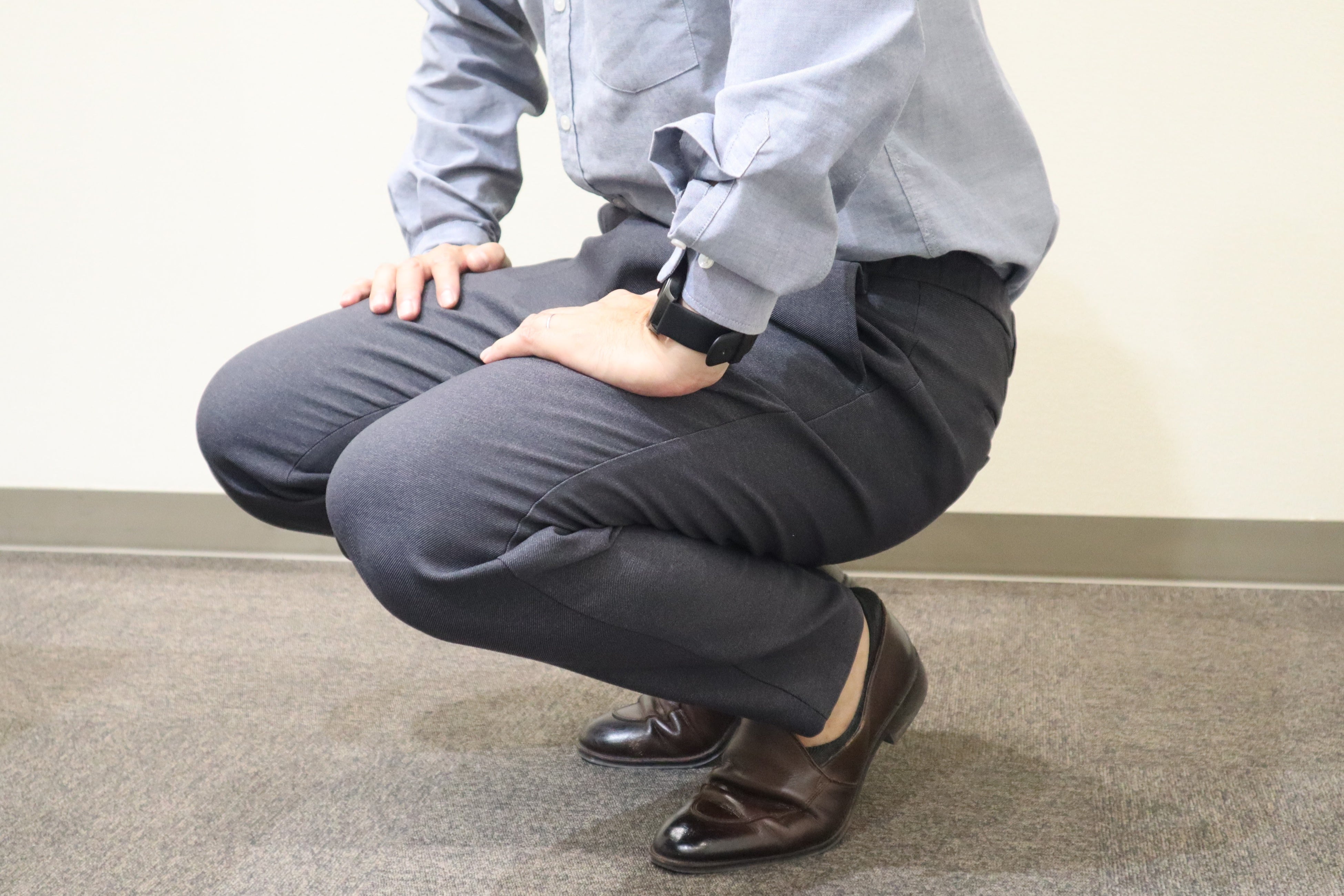 昨今のビジネススタイルの多様化により、カジュアルな装いも選択肢の一つになっています。そのような中で、ビジネスシーンにおいてもスウェットパンツのように、楽で快適な履き心地でありながらも、キレイ目な服装にも合わせやすい“進化系カジュアルパンツ”を企画しました。今回のポイントは、スウェットのような着用感を実現するため、フロントホックやファスナーなどの伸縮性を妨げる付属品を省いてます。フロントの表と裏部分には、スライドして伸びるゴムに加えて、ウエストサイド部分にもシャーリングゴムを取り付けているため、座った時の窮屈感を軽減し快適に着用できます。また、前立て部分を完全に閉じてしまうと伸長率が弱くなるため少し開いているものの、座った時に前立て部分の生地が浮かないように何度も調整を行っており、ビジネスシーンで使いやすいスラックスにするために、フロント部分にダミーでファスナー風の縫い付けを施してます。