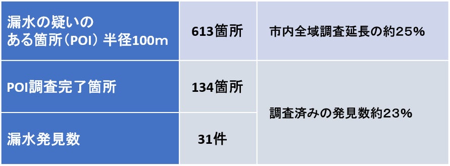 令和7年8月に衛星画像解析を完了し、漏水の疑いのある箇所(POI)の特定を終え、10月から現地調査を実施しています。11月30日時点で31件の漏水を発見しており、早期の修繕につなげています。