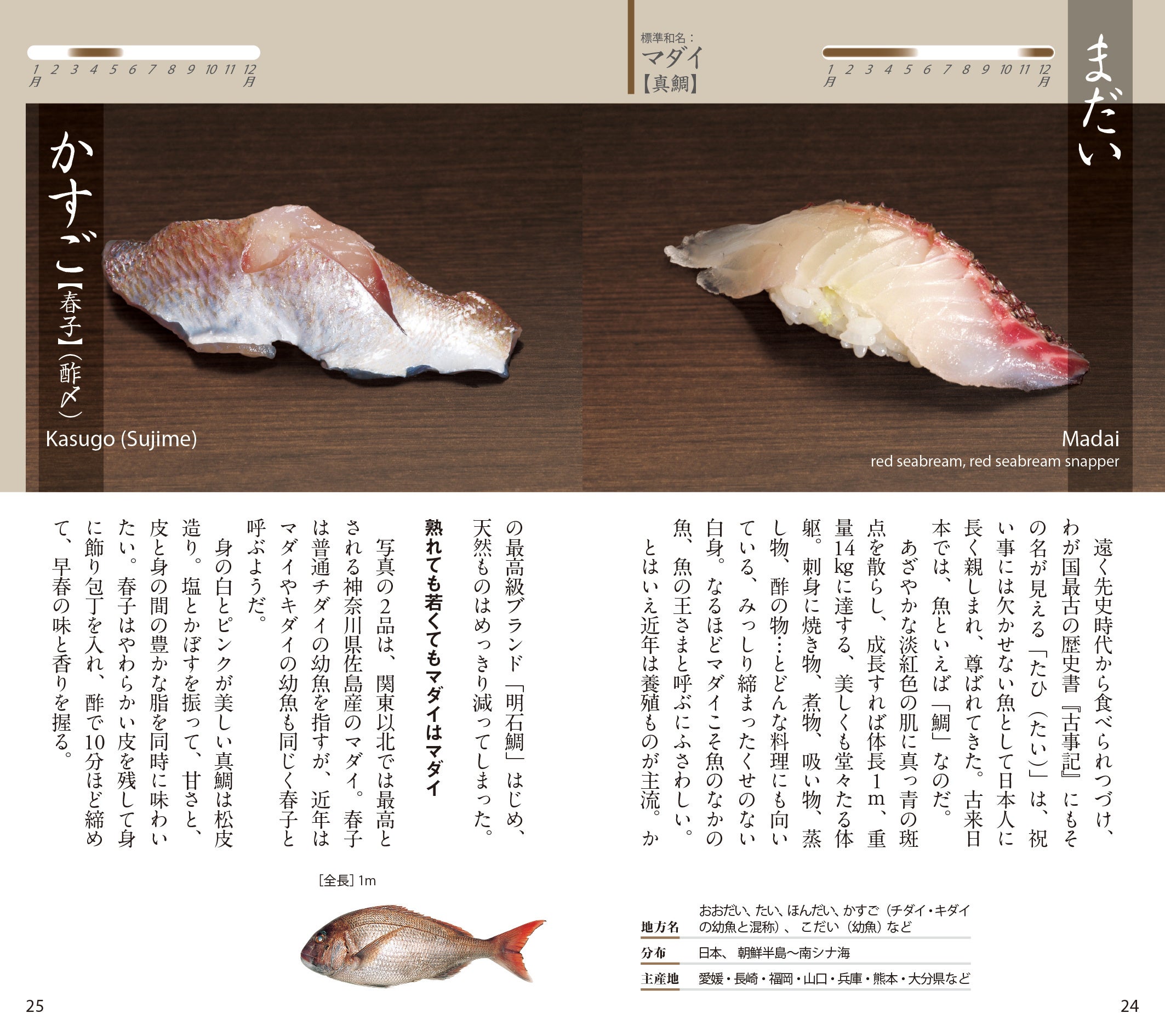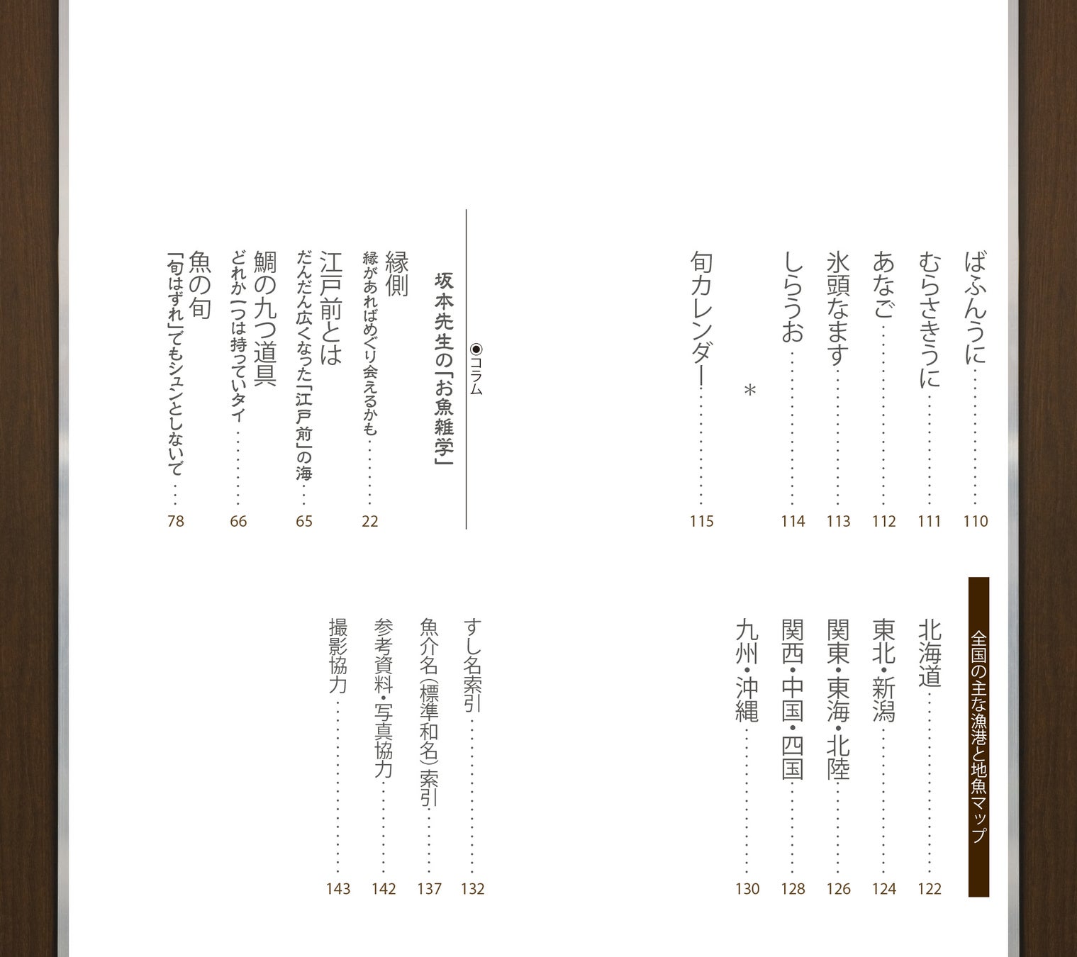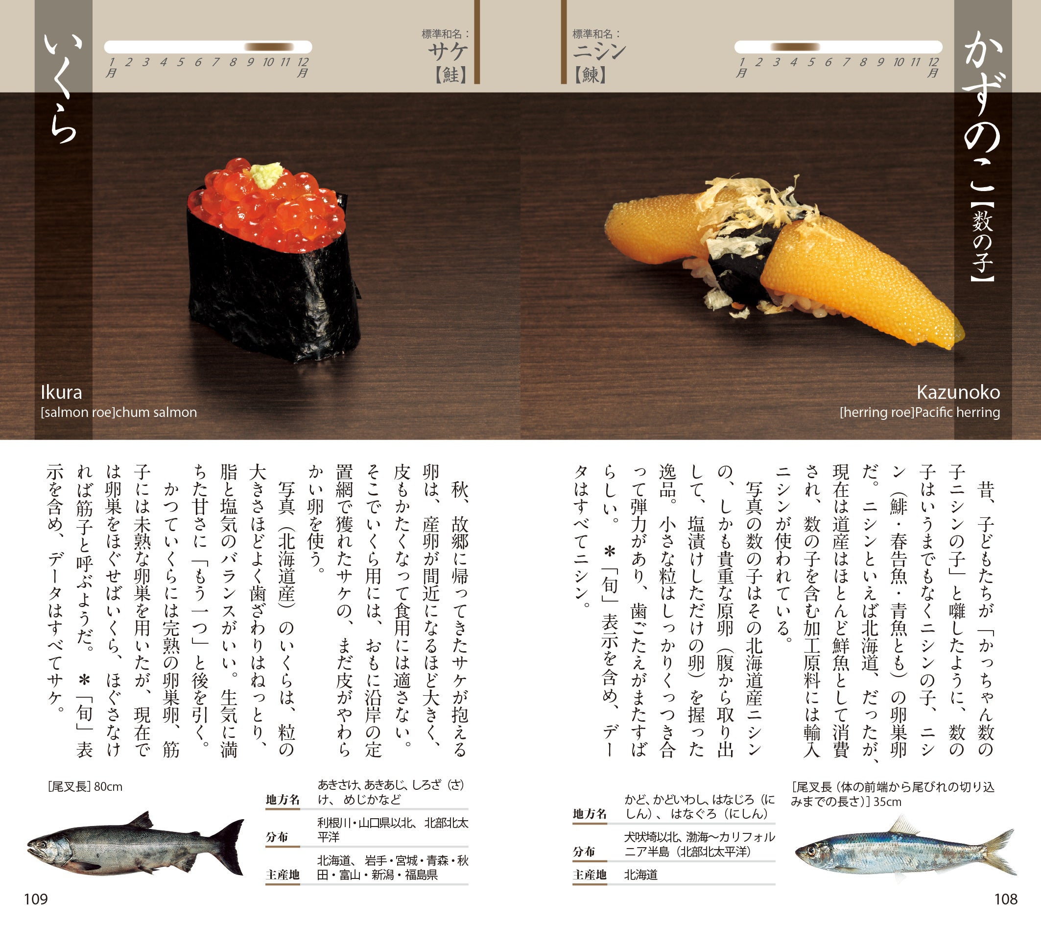握りの写真,素材の魚についての解説,薀蓄,旬,姿写真,主産地,英語名など,すし通のための完璧なデータがつまったコンパクトな手帳。