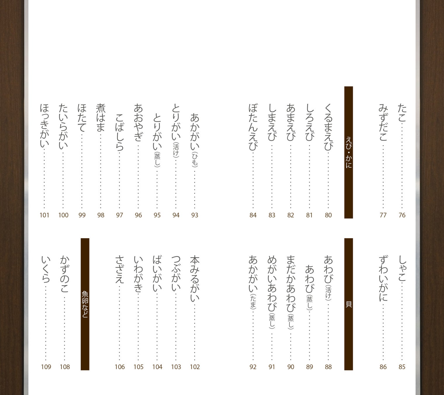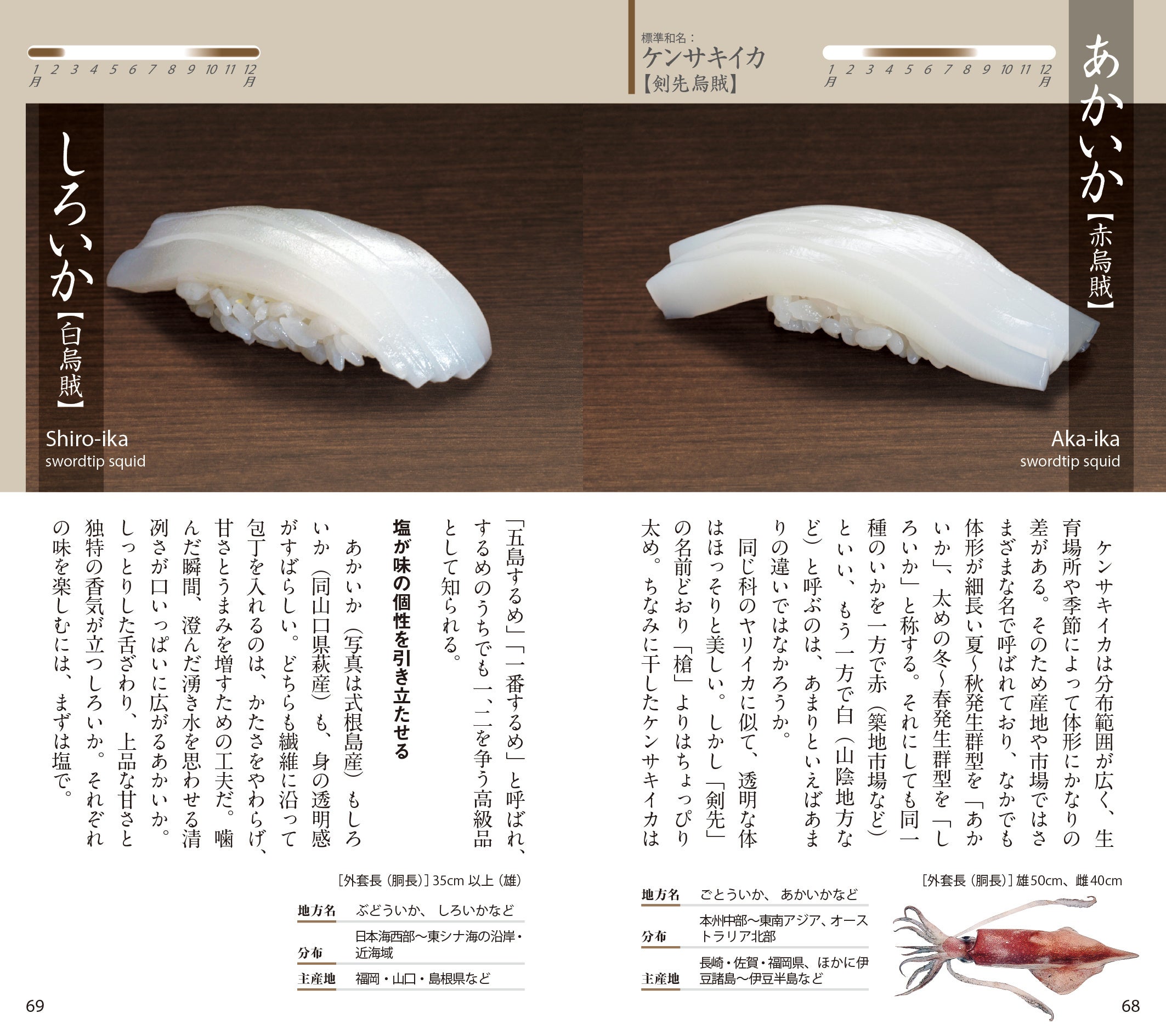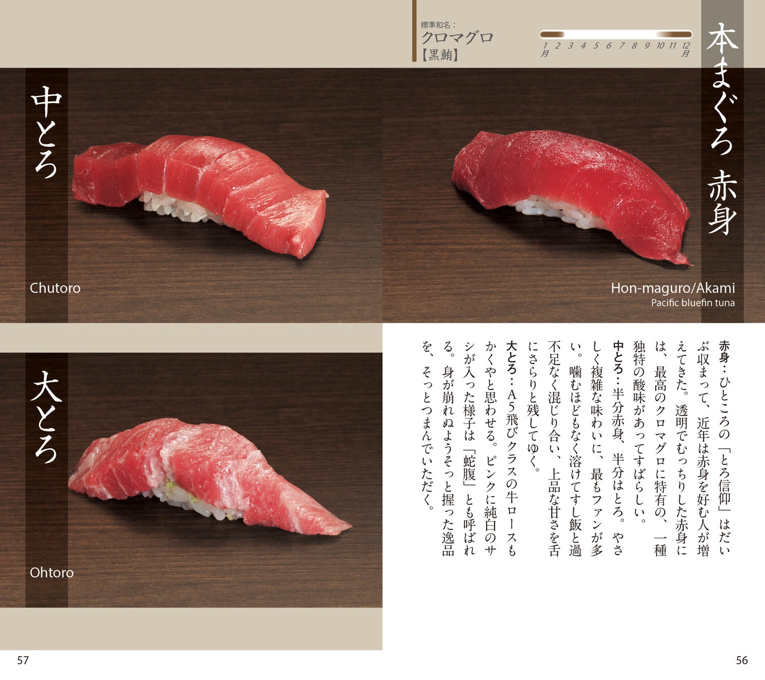 握りの写真,素材の魚についての解説,薀蓄,旬,姿写真,主産地,英語名など,すし通のための完璧なデータがつまったコンパクトな手帳。
