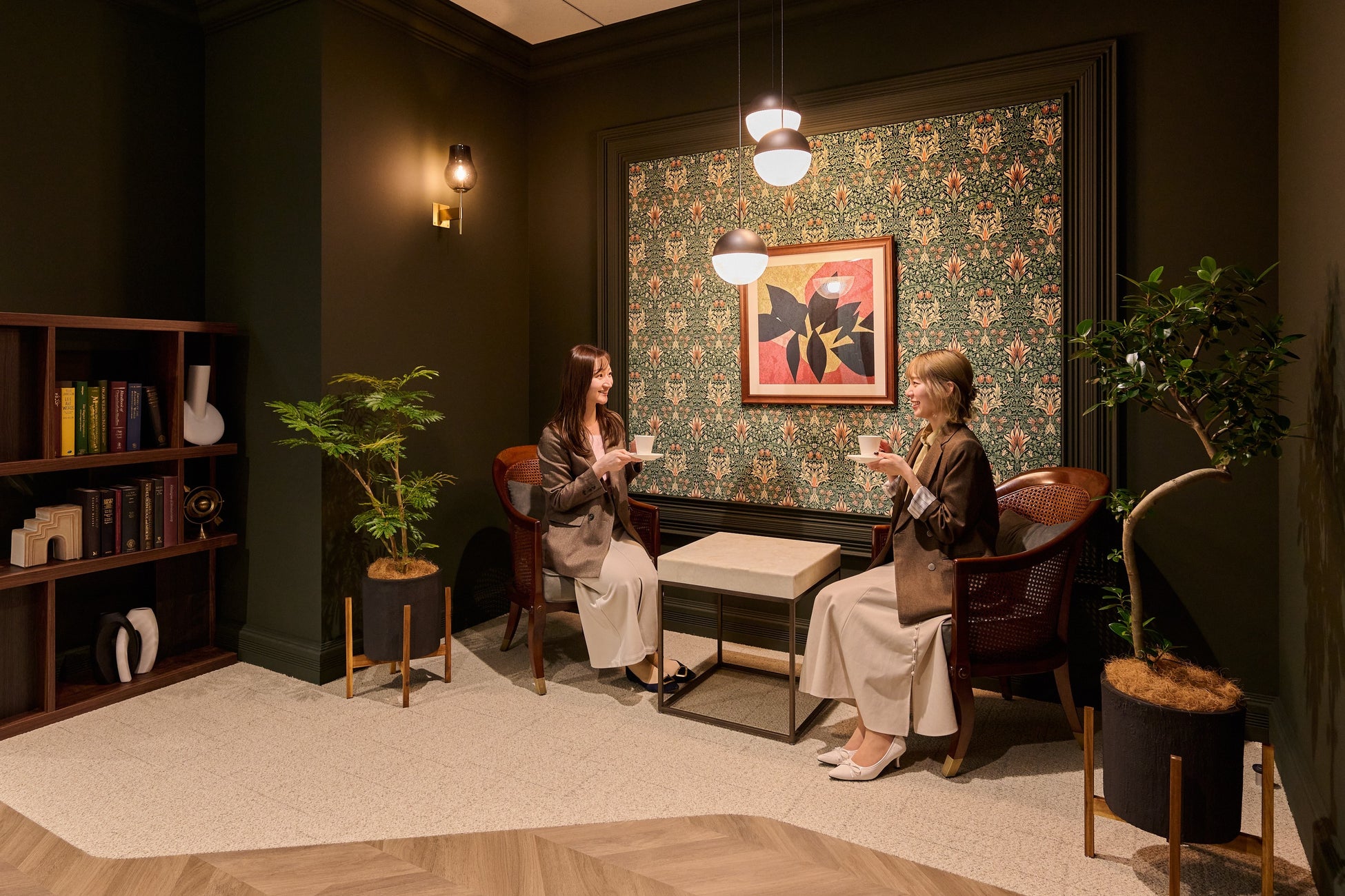 本センターの内装は、“緑の理想郷に佇む探求者”をテーマに、英国コロニアルの気品と現代都市のエネルギーを融合させたデザインです。落ち着きのある洗練されたグリーンを基調とした空間は、都市公園に隣接する立地とも呼応し、自然の安らぎと知的創造性を同時に感じられるワークプレイスを実現しています。