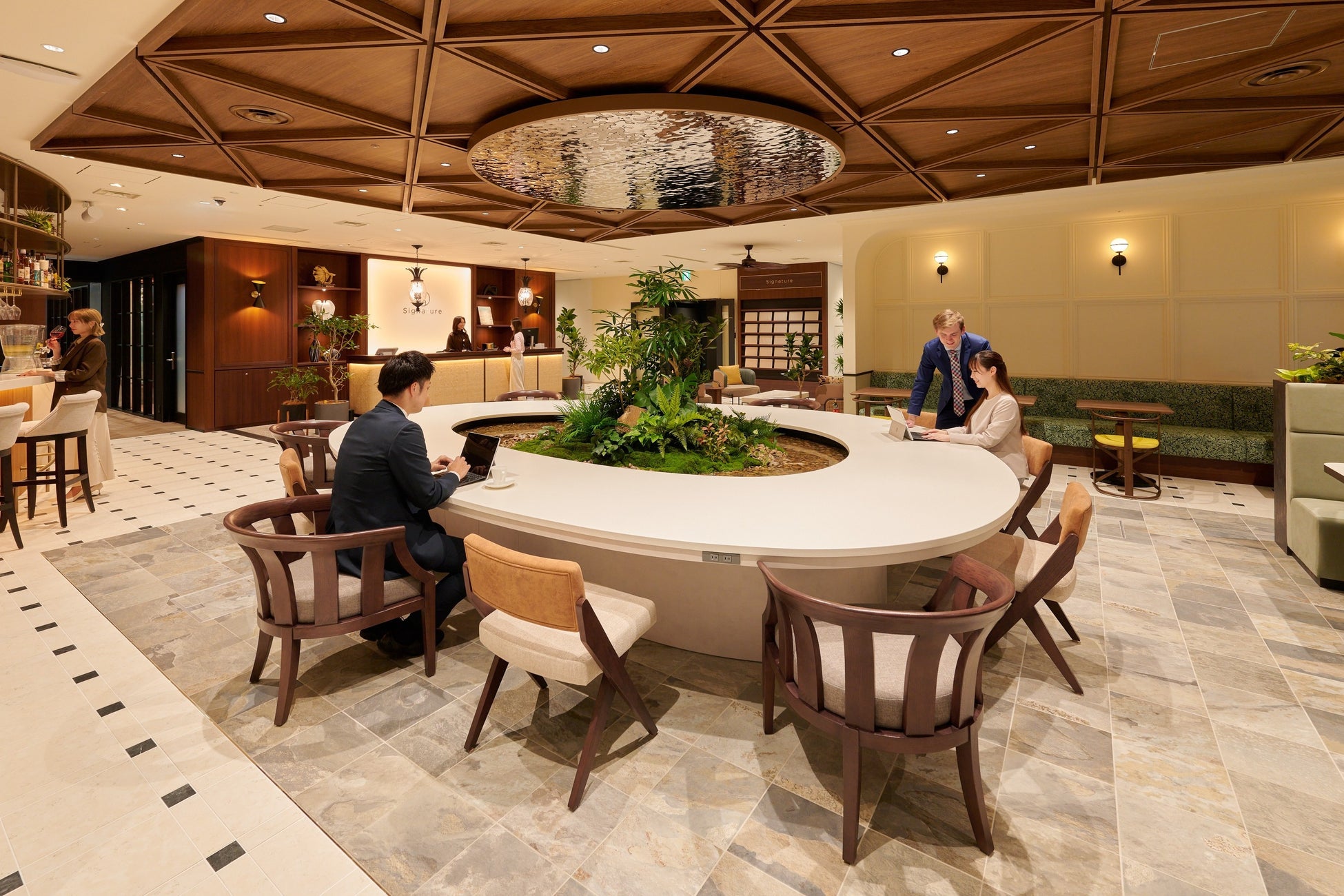 エントランスにはクラシカルな素材感を活かしたレセプションと豊かな植栽を配置し、訪れる人を温かく迎え入れる上質な空気感を演出。共用ラウンジは天井意匠や円形テーブルを中心とした開放的なレイアウトで、入居者同士の交流やインスピレーションを促す空間に仕上げています。ビジネスに求められる快適さとクリエイティビティを兼ね備えた、グラングリーン大阪ならではの新しいオフィス体験を提供します。