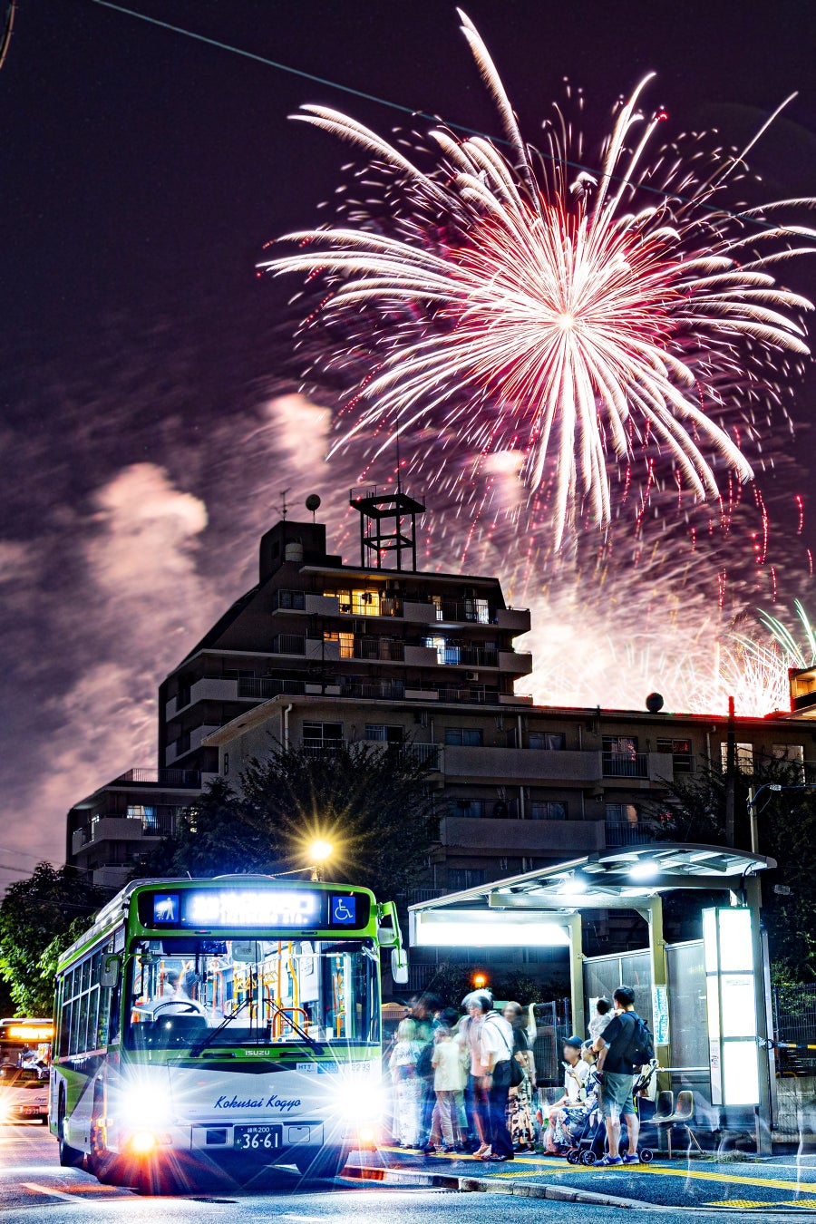 年に一度、高島平操車場が人であふれかえる花火大会。 観客輸送の合間、花火を背に一瞬の安らぎが訪れる瞬間を切り取っています。 |