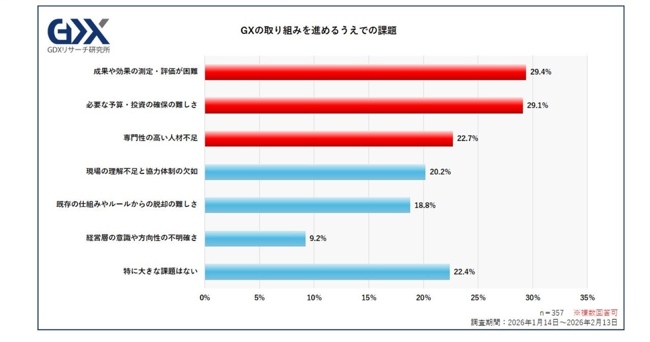 では、GXの取り組みを進めるうえで、何が障害になっているのでしょう。最も多い理由は「成果や効果の測定・評価が困難」(29.4%)、さらに「必要な予算・投資の確保の難しさ」(29.1%)、「専門性の高い人材不足」(22.7%)となりました。また、「現場の理解不足と協力体制の欠如」(20.2%)、「既存の仕組みやルールからの脱却の難しさ」(18.8%)などの、実行段階における課題があることがわかりました。
