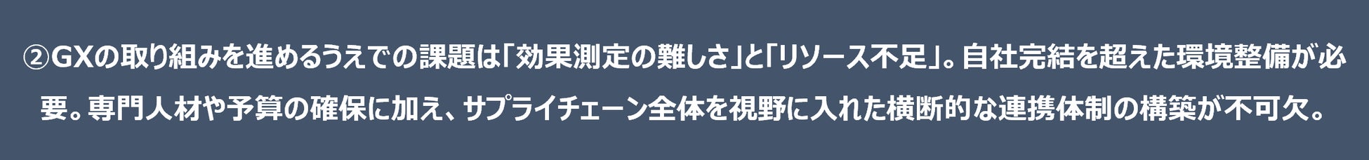 GXの推進においては、予算や人材などの経営資源の確保に加え、効果の可視化や評価指標の整備が大きな課題となっています。GXは環境対応という性質上、効果を定量的に把握しづらく、投資判断の難しさにつながっている可能性があります。また、GXは自部門、自社だけで完結する取り組みではなく、調達・生産・物流などの各部門に加え、取引先やサプライチェーン全体を視野に入れた対応が求められる場合もあります。