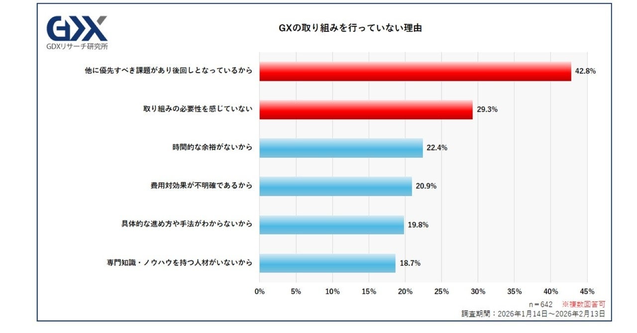 GXの取り組みを行っていない理由として最も多かったのは「他に優先すべき課題があり後回しとなっているから」(回答企業中・42.8%)であり、群を抜いて多く、回答数が2番目に多かったのは「取り組みの必要性を感じていない」(同・29.3%)でした。