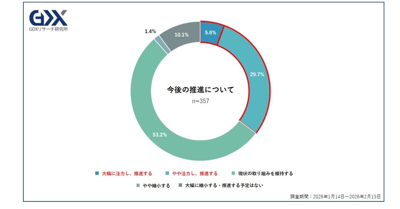 すでにGXに取り組んでいる企業に対し、今後の推進意向について聞いたところ、「大幅に注力し、推進する」が5.6%、「やや注力し、推進する」が29.7%、「現状の取り組みを維持する」が53.2%となり、現状維持を含めて88.5%の企業が、今後もGXを継続する意思を示していました。ただ、最も多い回答が「現状の取り組みを維持する」であり、GXは現時点では積極的に拡大するというよりも、現状維持を軸に慎重に継続する段階にあるといえます。