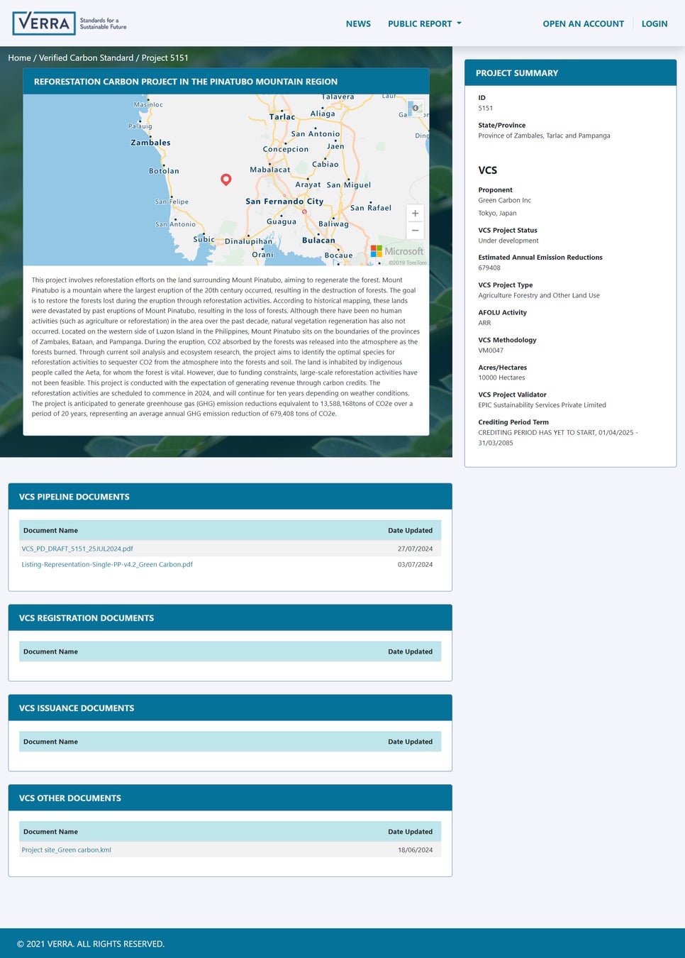 Green Carbon株式会社(代表取締役:大北潤、以下Green Carbon(読み:グリーンカーボン)はこの度、 日本企業初となるフィリピン ピナツボ火山での植林活動による吸収系カーボンクレジット創出PJの申請が*¹Verraに受理され、ID5151としてリスト化され、20年間で約1300万トンのGHG削減効果をもたらします。また、本プロジェクトの出資や創出したカーボンクレジットを購入するプロジェクトパートナーを募集します。