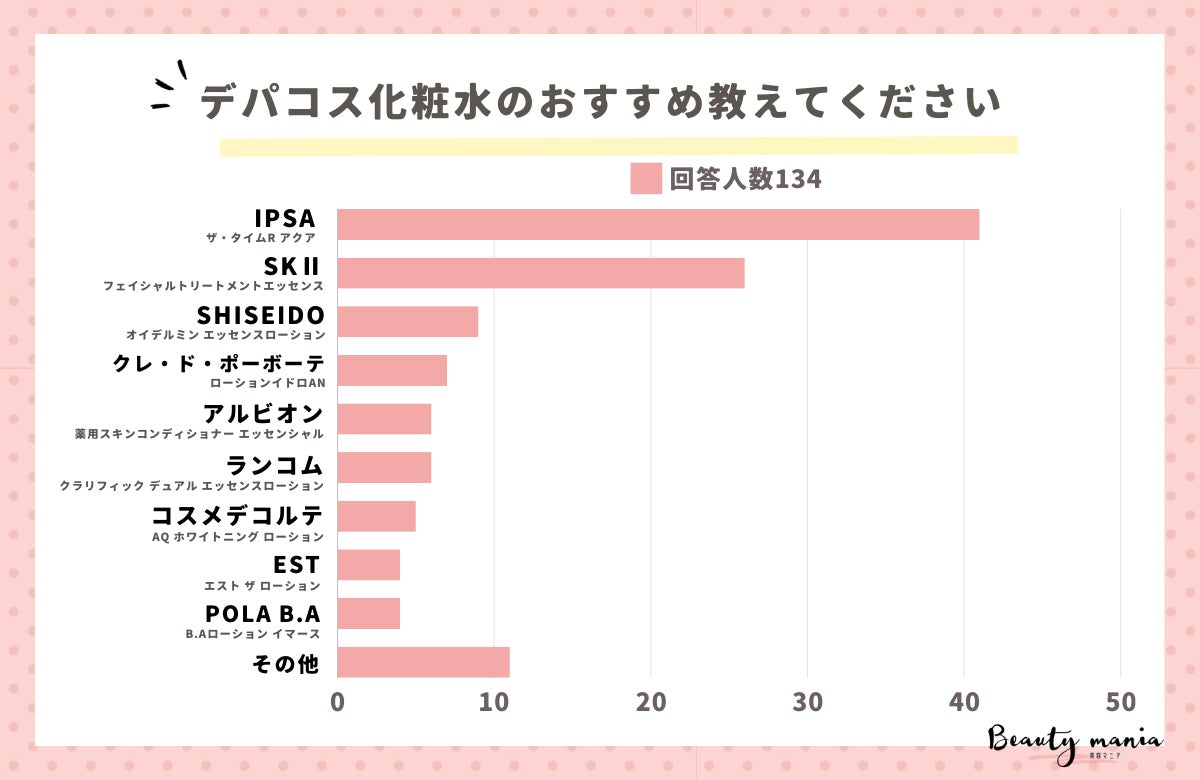 「使ってよかったデパコス化粧水のおすすめは?」とアンケート調査した結果、1位は『IPSA| ザ・タイムR アクア(41人)』、2位は『SKⅡ | フェイシャルトリートメントエッセンス(26人)』、3位は『SHISEIDO(資生堂) | オイデルミン エッセンスローション(9人)』となっています。
