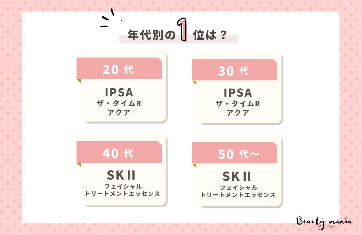 使いやすい化粧水としてイプサが人気の一方で、40代50代ではSKⅡなど「高いけど良いものは良い」と高価格帯の化粧水も人気でした。