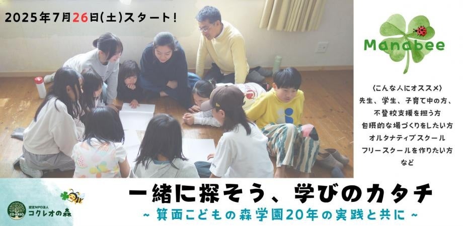 認定NPO法人コクレオの森(箕面こどもの森学園)は、教育現場や子育て、子どもの居場所づくりに関わるすべての方へ向けた連続プログラム「学び場コーディネーター Manabee プログラム 2025」を、7月26日より開催します。