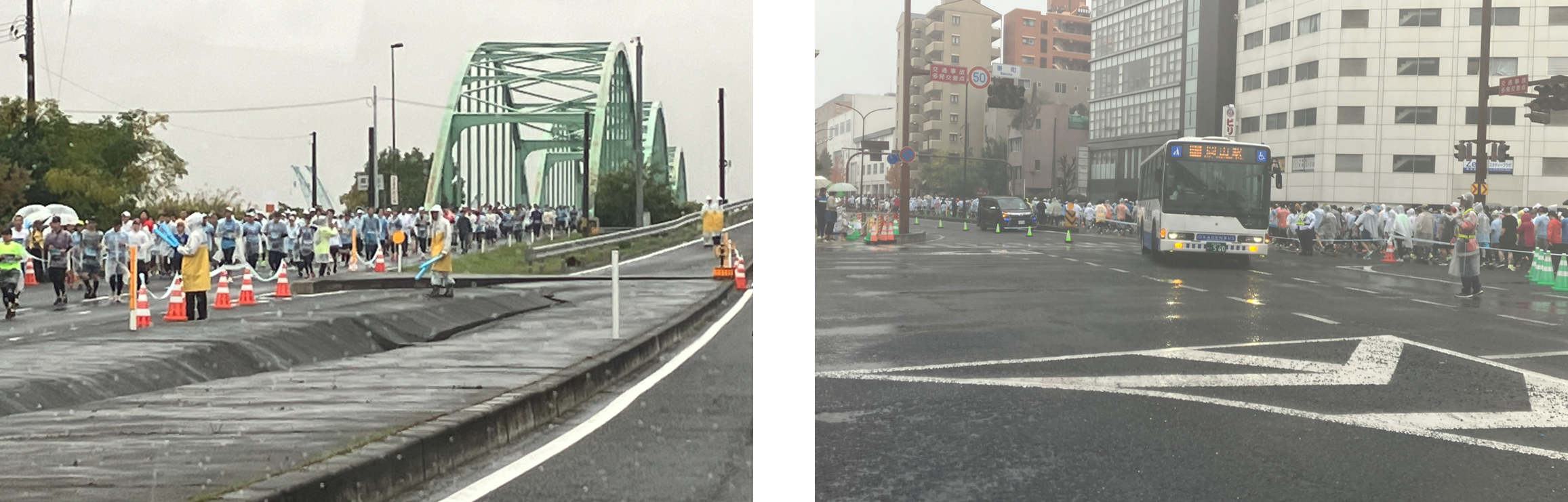 日本管財は、今年で9回警備業務を実施しており、分単位の閉鎖時刻が設けられた計11の関門などを計画通りに運営できるよう、警備計画を策定しました。雨天の中決行された大会当日は、JR岡山駅などの施設利用者とランナーの動線整理、観光客と応援者の混在対策などを行いました。