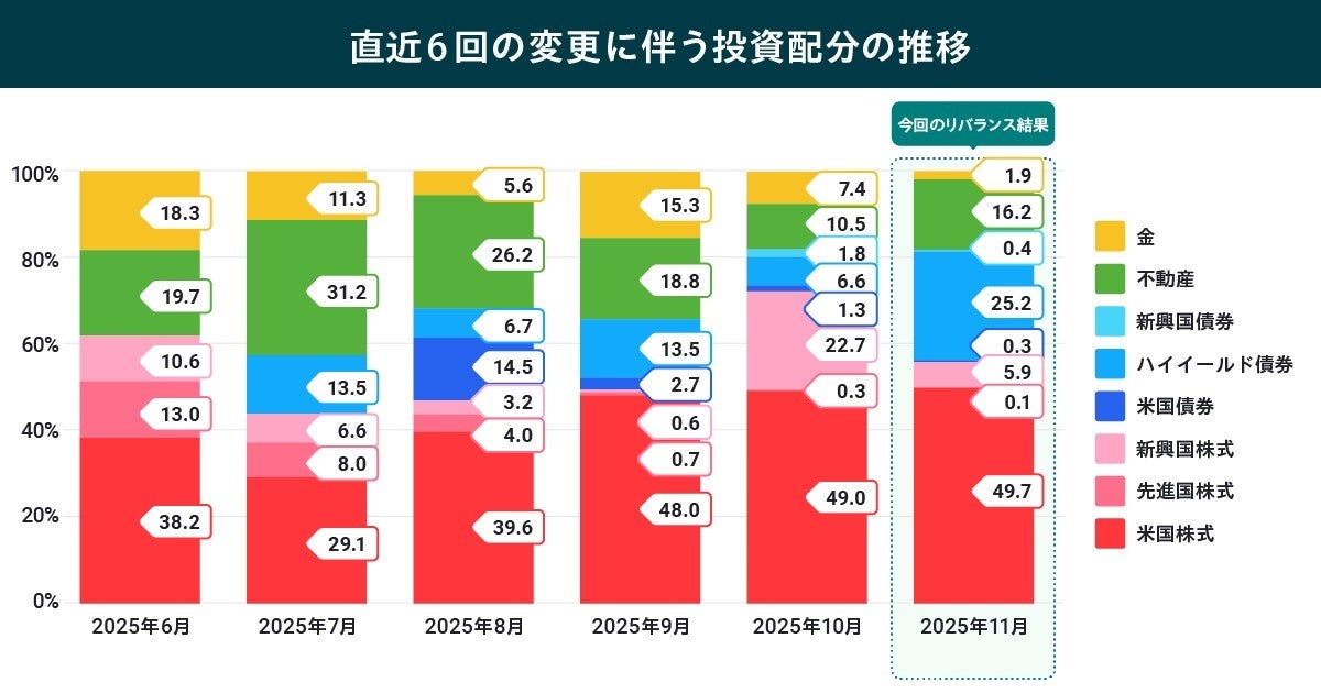 ※上記投資配分について、2025年6月は5月29日、2025年7月は6月27日、2025年8月は7月29日、2025年9月は8月29日、2025年10月は9月30日、2025年11月は10月29日のそれぞれの変更時点の比率を示しています。