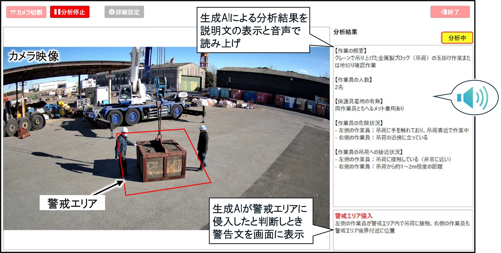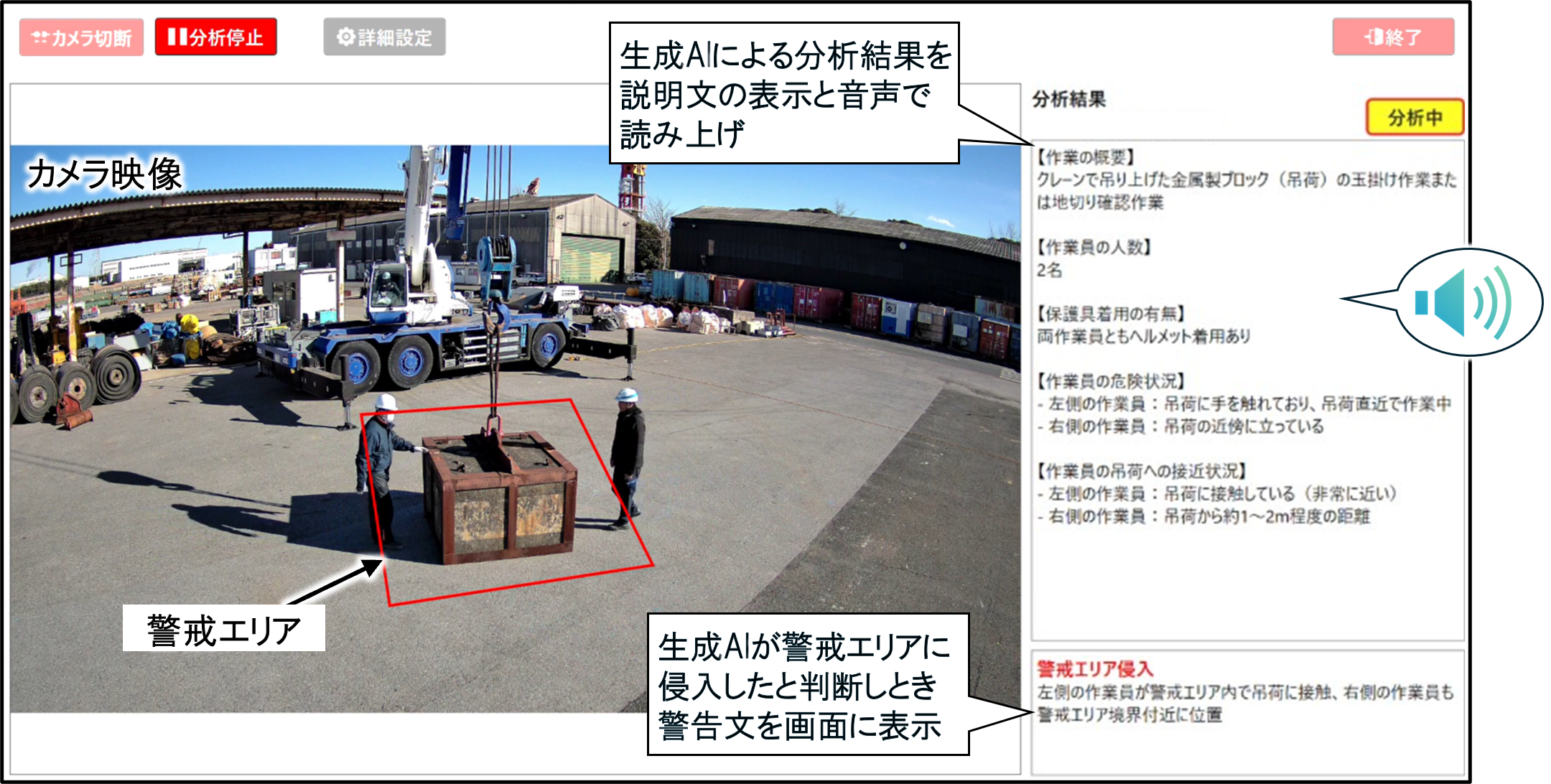 本システムには、画像と言語情報を統合的に理解・処理できる生成AI技術「Vision-Language Model(VLM/視覚言語モデル)」を活用しています。現場に設置したパソコンから市販のクラウド型AIサービスとAPI(Application Programming Interface)※2で連携し、工事現場のカメラ映像を分析します。システム上では、カメラ映像から任意の間隔で画像を切り出し、事前に登録した指示文(プロンプト)とともにAPI経由で生成AIに送信します。それにより、生成AIが画像内容とプロンプトをもとに現場状況を分析し、結果を説明文と音声で通知します。さらに、パソコン画面の映像上で警戒エリアを設定でき、プロンプトで指定した人物や物体などの監視対象物がエリアに入った際に警告文で通知します。