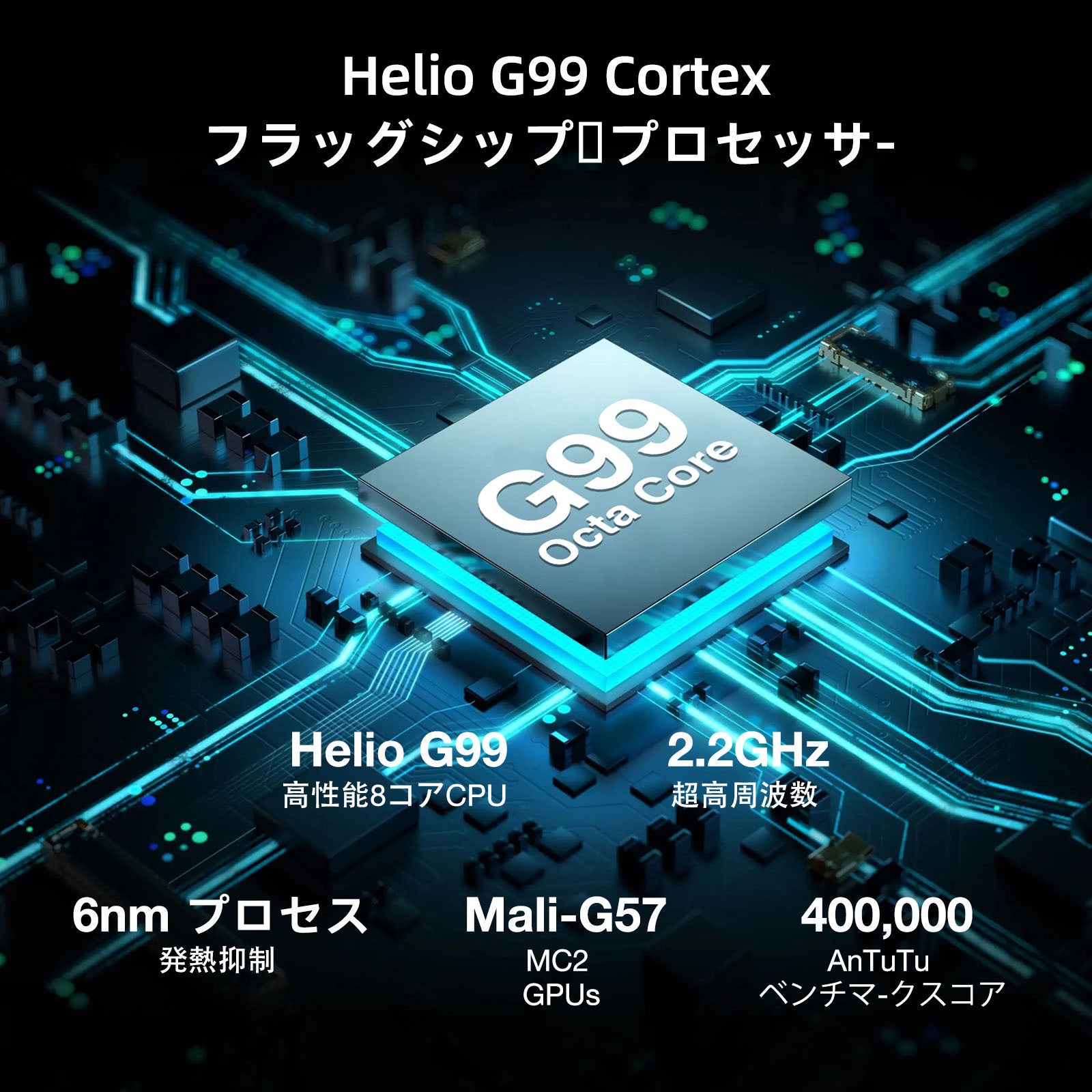 Helio G99は先進の8nmプロセスで製造され、8つの高性能コアを搭載しています。 各コアのクロックは最大2.5GHzで、優れた処理能力とスムーズなマルチタスク体験をユーザーに提供します。 大規模なゲームやマルチメディア・アプリケーションの実行、複雑なコンピューティング・タスクの実行など、Helio G99なら簡単に処理できます。 高度なグラフィックス:このプロセッサーには、優れたグラフィックス処理能力を持つMali-G77 MC9 GPUが統合されています。 最高のゲーム画質と滑らかさをサポートし、ユーザーにリアルな視覚効果と素晴らしいゲーム体験をもたらします。 高画質ゲーム、3Dレンダリング、ビデオ編集のいずれにおいても、Helio G99は卓越したグラフィックス性能を発揮します。