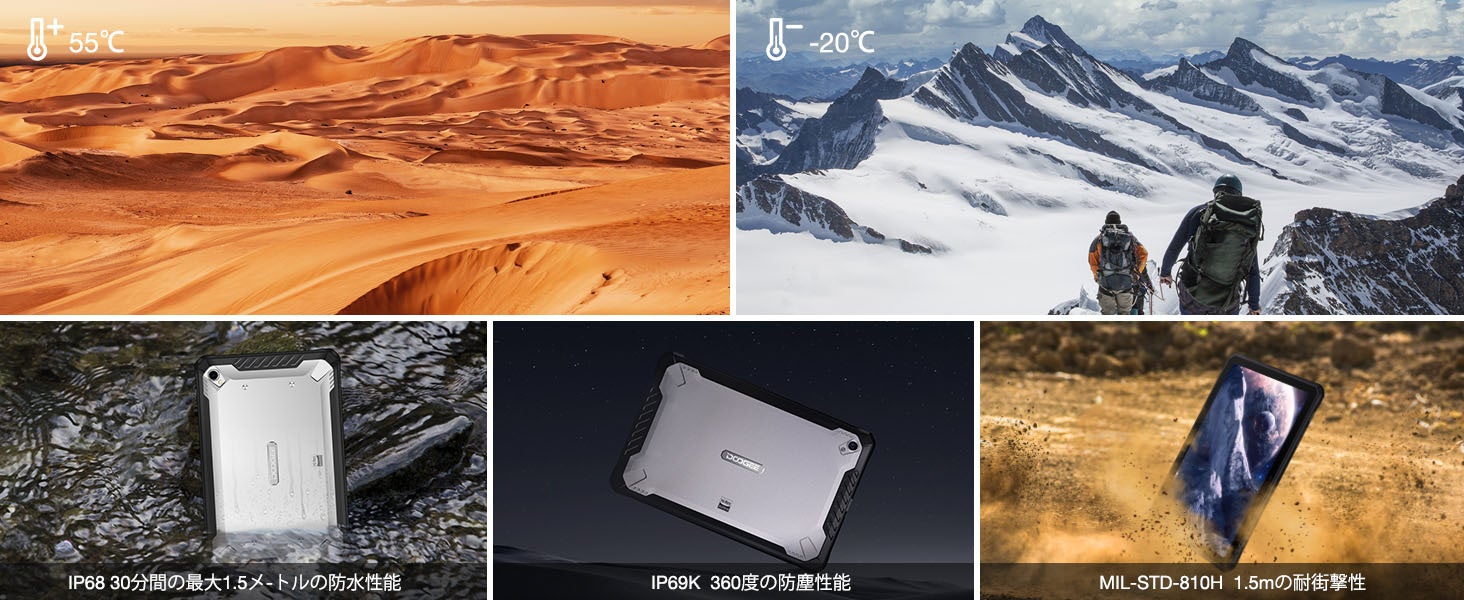DOOGEE R10は、IP68およびIP69K認証を取得しており、完全防水・防塵です。 ビーチやハイキング、大雨の中でも安心して持ち運ぶことができます。 ある程度の水深まで浸水しても大丈夫で、ホコリの侵入を防ぐために密閉されています。 防水・防塵だけでなく、耐衝撃性にも優れています。 頑丈な構造と補強されたコーナーにより、誤って落としたりぶつけたりしても、タブレットを傷つけることはありません。 デバイスがしっかりと保護されているため、安心して仕事や遊びをすることができます。 いつでも、どこでも、自由に仕事や遊びを楽しむことができます。 かつてない耐久性、信頼性、高性能を体験してください!