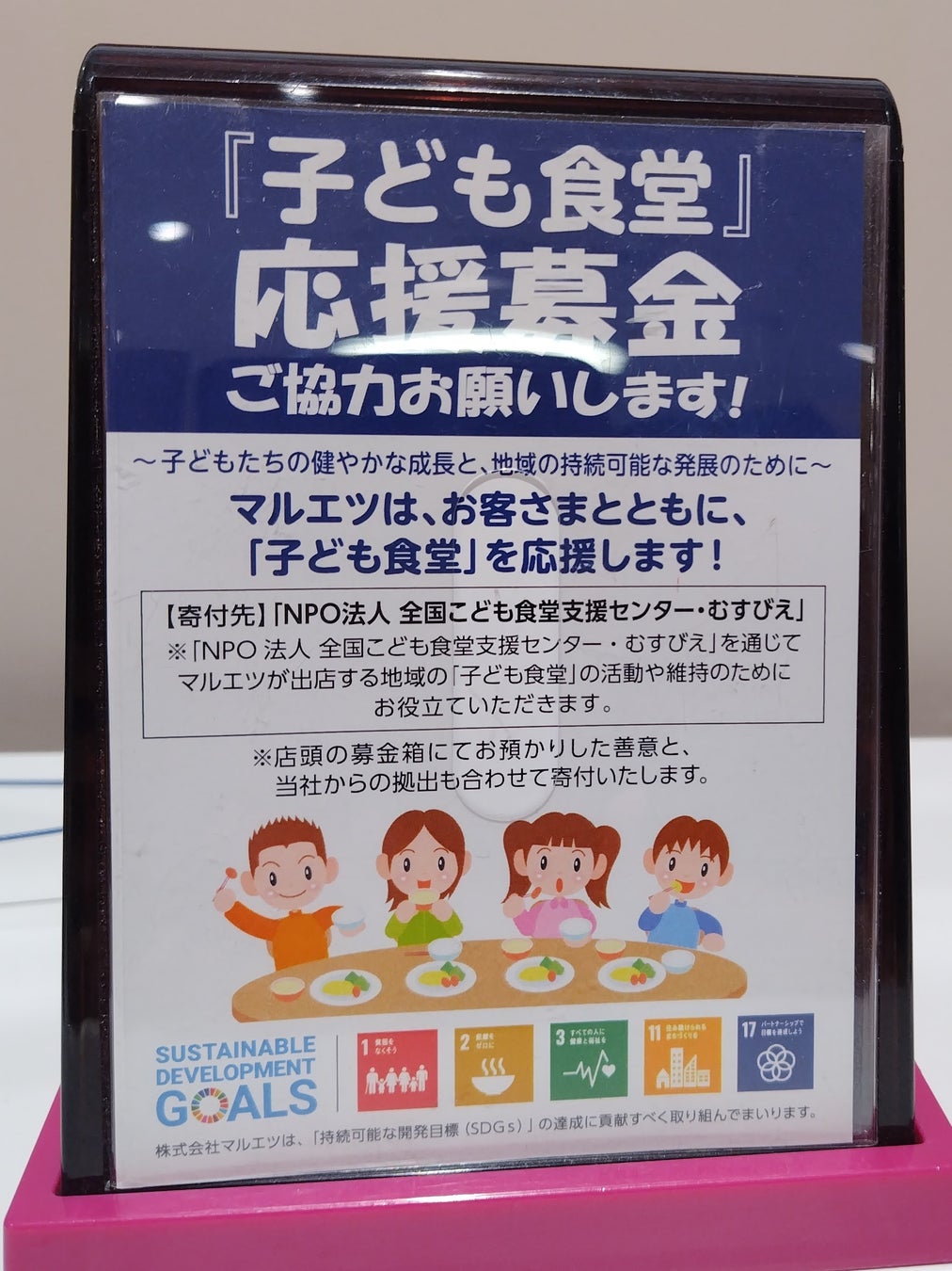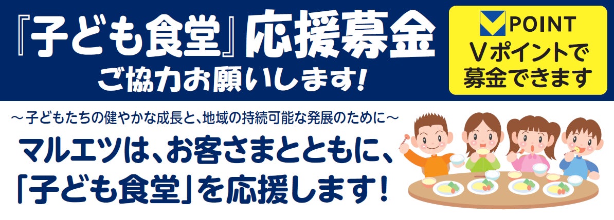 また、マルエツでは、子どもたちが安心できる居場所や地域とのつながりを提供する「子ども食堂」を応援するため、全店舗に募金箱を設置し、子ども食堂応援募金を実施しています。