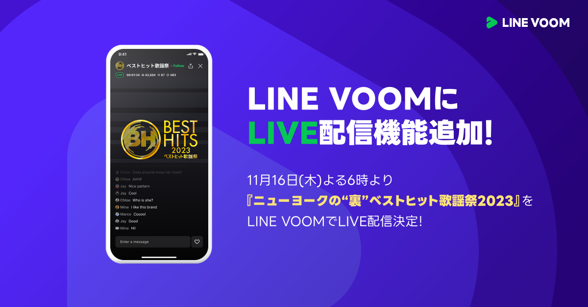 LINEヤフー株式会社(以下、LINEヤフー)は、「LINE」アプリ内の動画プラットフォーム「LINE VOOM」において、『ベストヒット歌謡祭』とのコラボ企画を実施します。あらたに「LINE VOOM」上でのライブ配信機能を追加し、初の生配信企画として、『ニューヨークの“裏”ベストヒット歌謡祭』やINIをゲストに迎える「LINE VOOM」独占企画を2023年11月16日(木)に配信するほか、出演アーティストのコメント動画などを配信予定です。