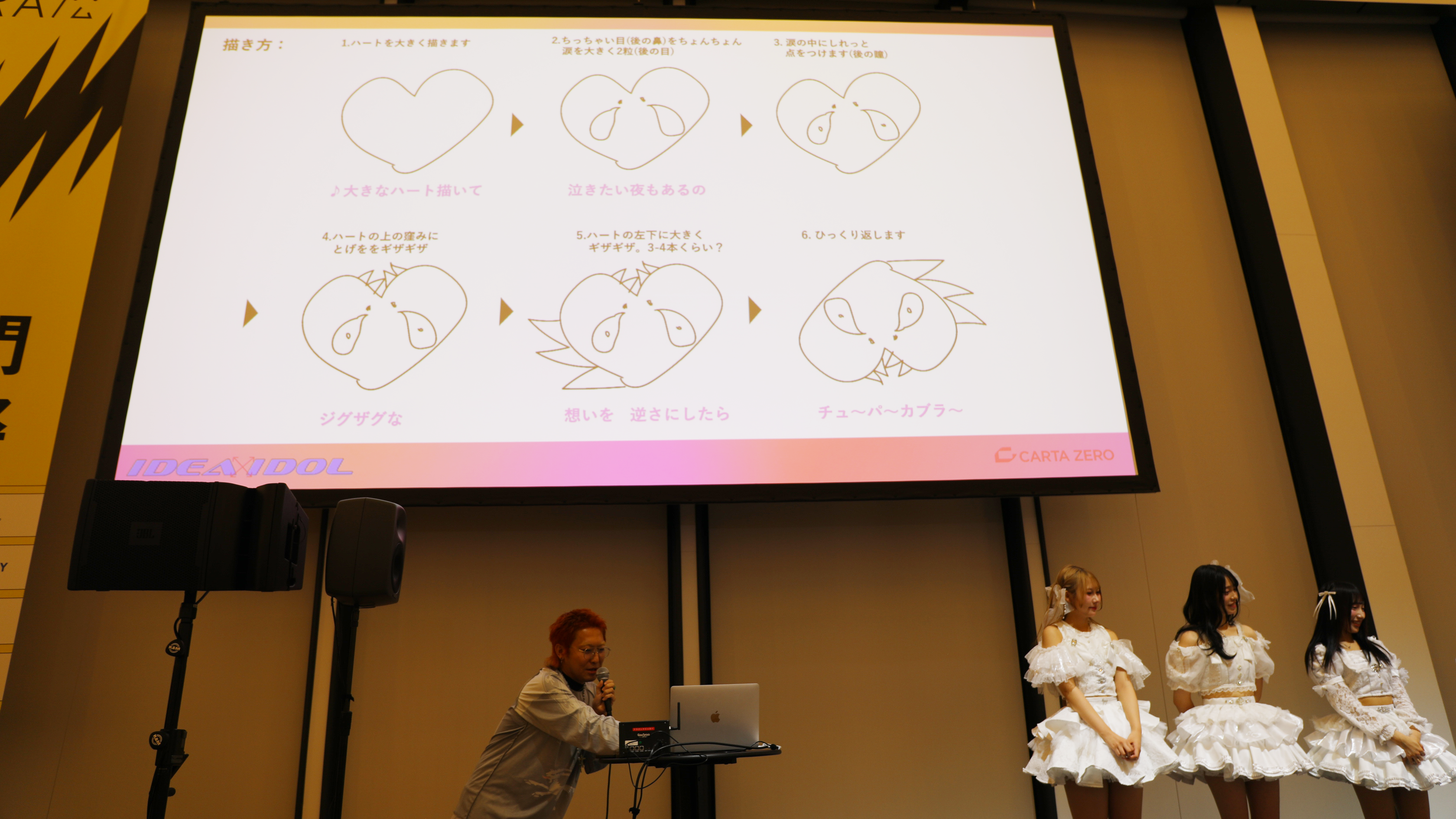 「絵描き歌×アイドル」という、これまでアイドル界ではほとんど例を見ないコンセプトを提案。田中賢一郎氏の「ガチ恋♡チュパカブLOVE」の企画をなぞり、ダンスパフォーマンス中に歌詞に沿って絵を描き、ひっくり返すとチュパカブラが現れる演出も披露されました。
