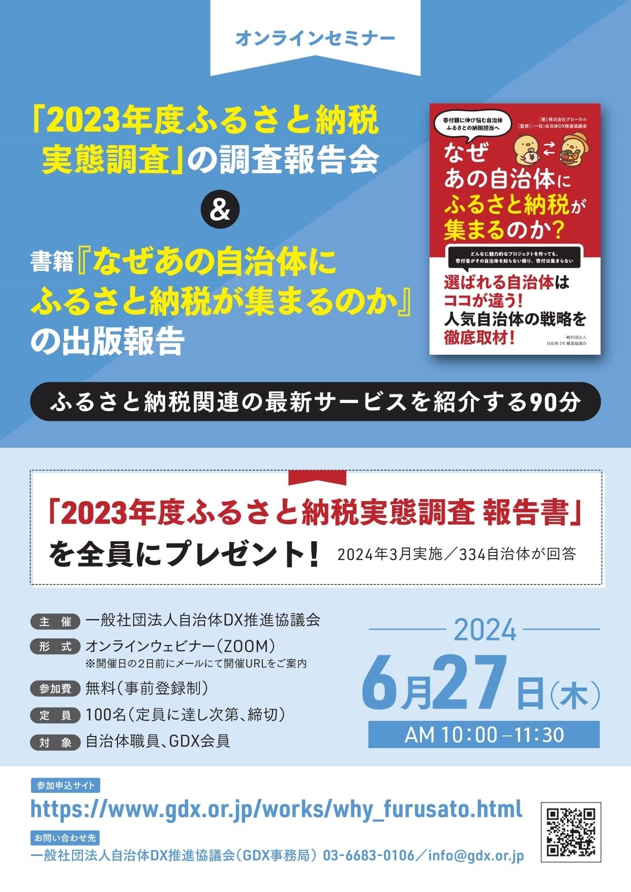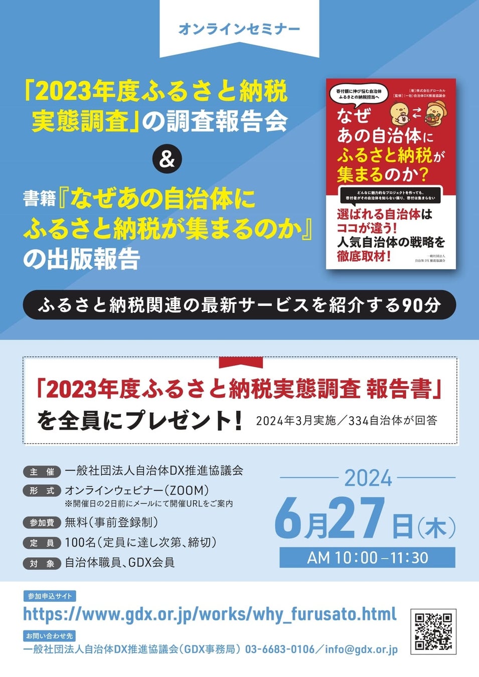 一般社団法人自治体DX推進協議会は、「2023年度ふるさと納税実態調査報告書」の発表と、書籍「なぜあの自治体にふるさと納税が集まるのか?」の出版を記念したオンライン報告会を2024年6月27日(木)AM10:00-11:30に開催いたします。
