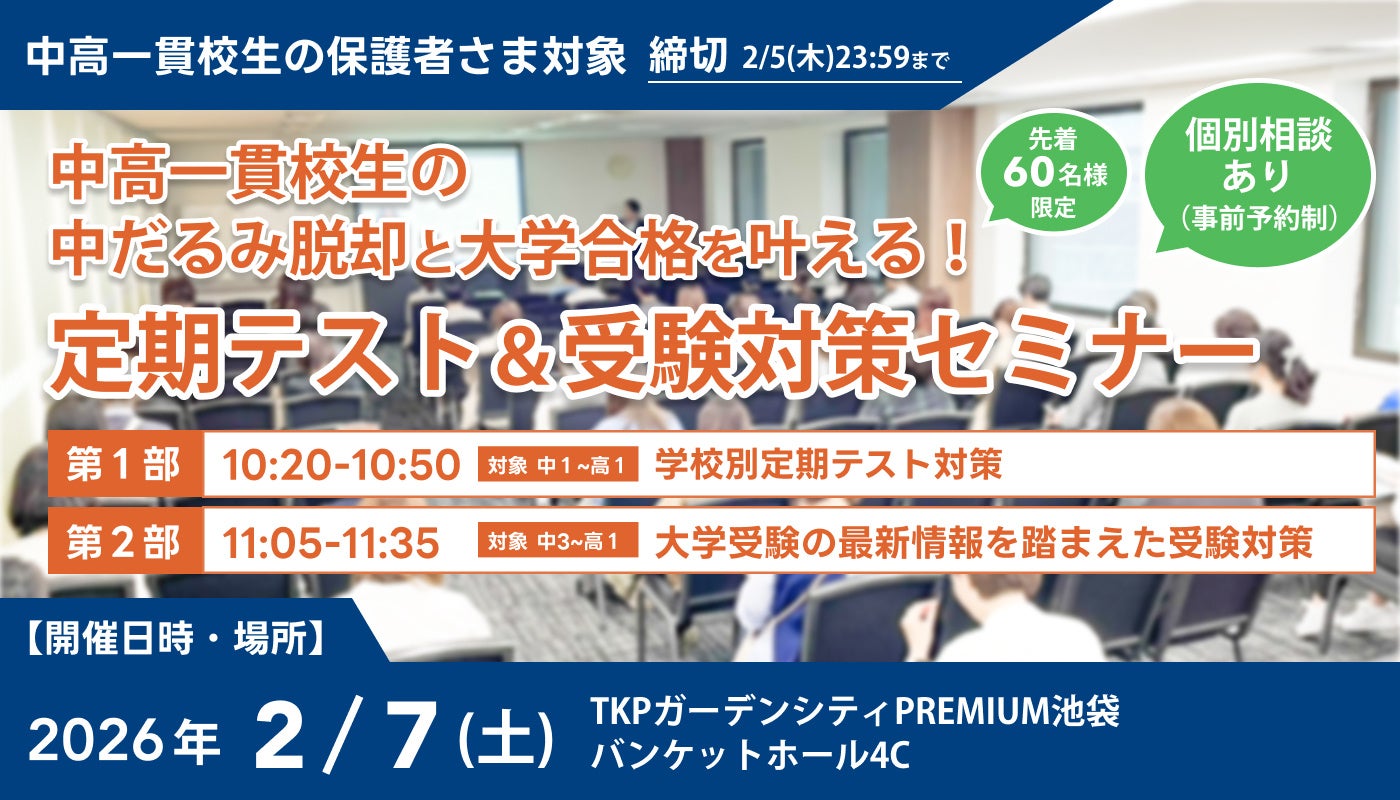 【累計参加者500名突破】中高一貫校生の「中だるみ脱却」と「大学合格」を叶える定期テスト&受験対策セミナー、2月7日(土)に池袋で開催決定!