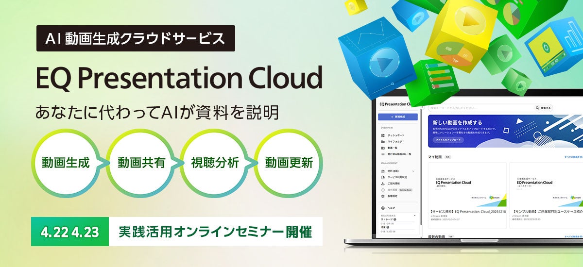 『EQ Presentation Cloud で実践! パワーポイント資料をナレーション付き動画へ 撮影・録画不要で「説明動画」をAI生成』と題し、Presentation Cloudの活用方法を紹介するオンラインセミナーを開催します。本セミナーでは、AIを活用してパワーポイント資料からナレーション付き動画を自動生成できるPresentation Cloudの実践的な活用法をご紹介。動画の生成に加え共有・配信から視聴分析まで、実際の操作デモンストレーションを交えて解説します。