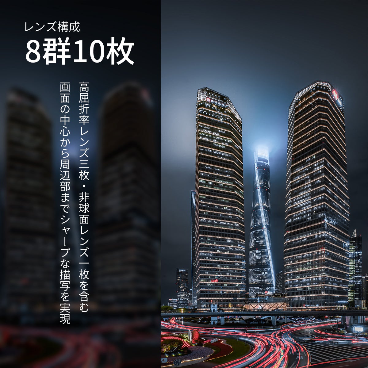 高屈折率レンズ3枚・非球面レンズ1枚を含む8群10枚の設計により、画面の中心から周辺部までシャープな描写を実現。細部まで描き込みたい建築写真や星景撮影にも安心の描写力です。