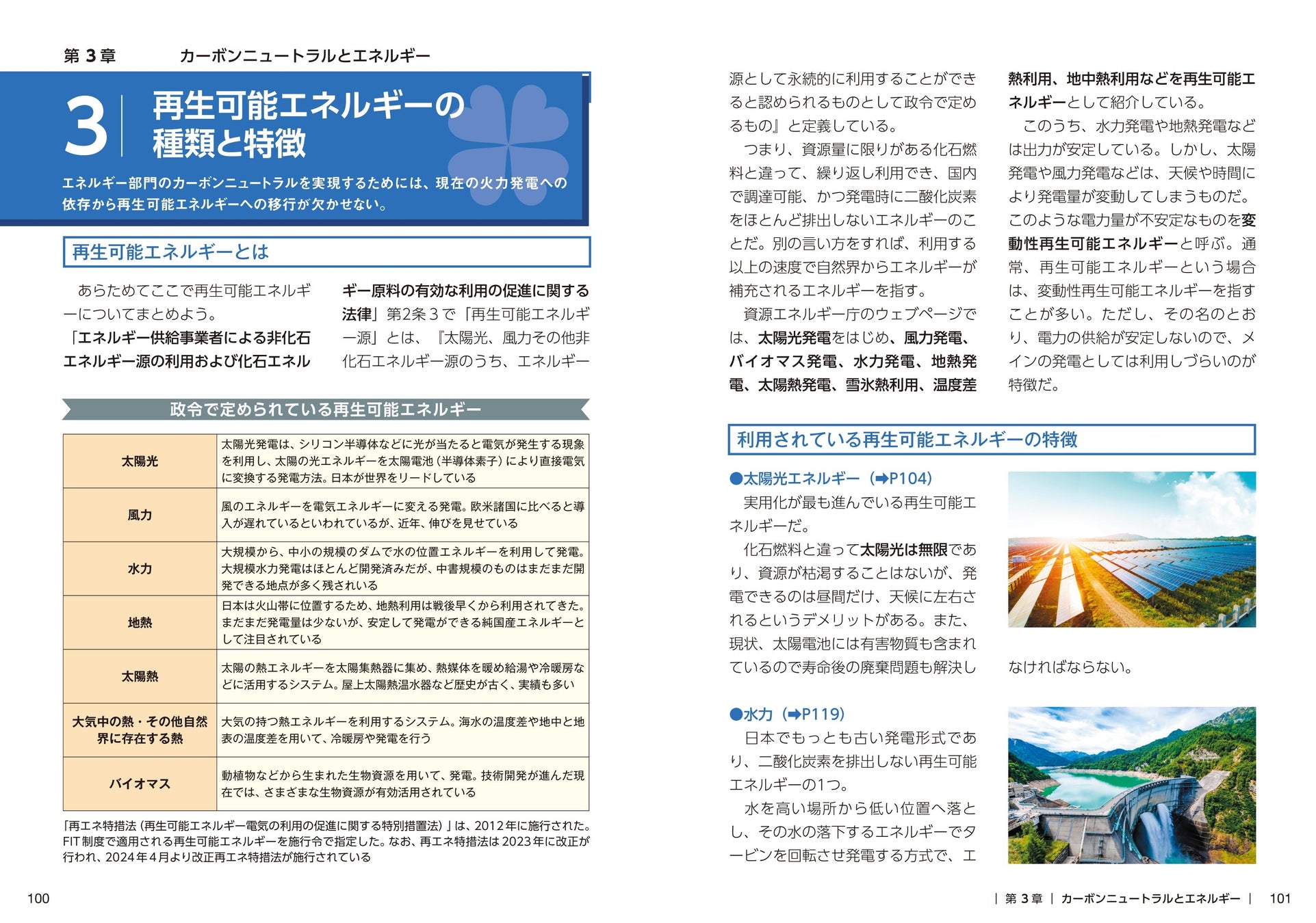 日本では現在、石炭や石油、天然ガスなどの二酸化炭素を排出するエネルギー源が主となっています。本書では、経済安全性を担保するためにも持続可能な再生可能エネルギーが求められること、伸びしろのあるエネルギー源や関連技術、それらの課題について解説しています。