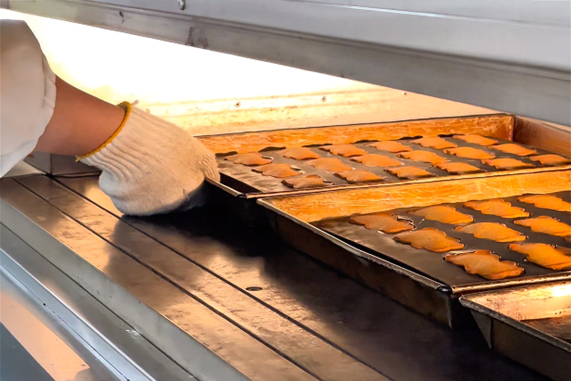 温度、時間、そして焼き色のつき方。職人は、一枚一枚のトレーの状態を見極めながら、最高の瞬間を逃しません。