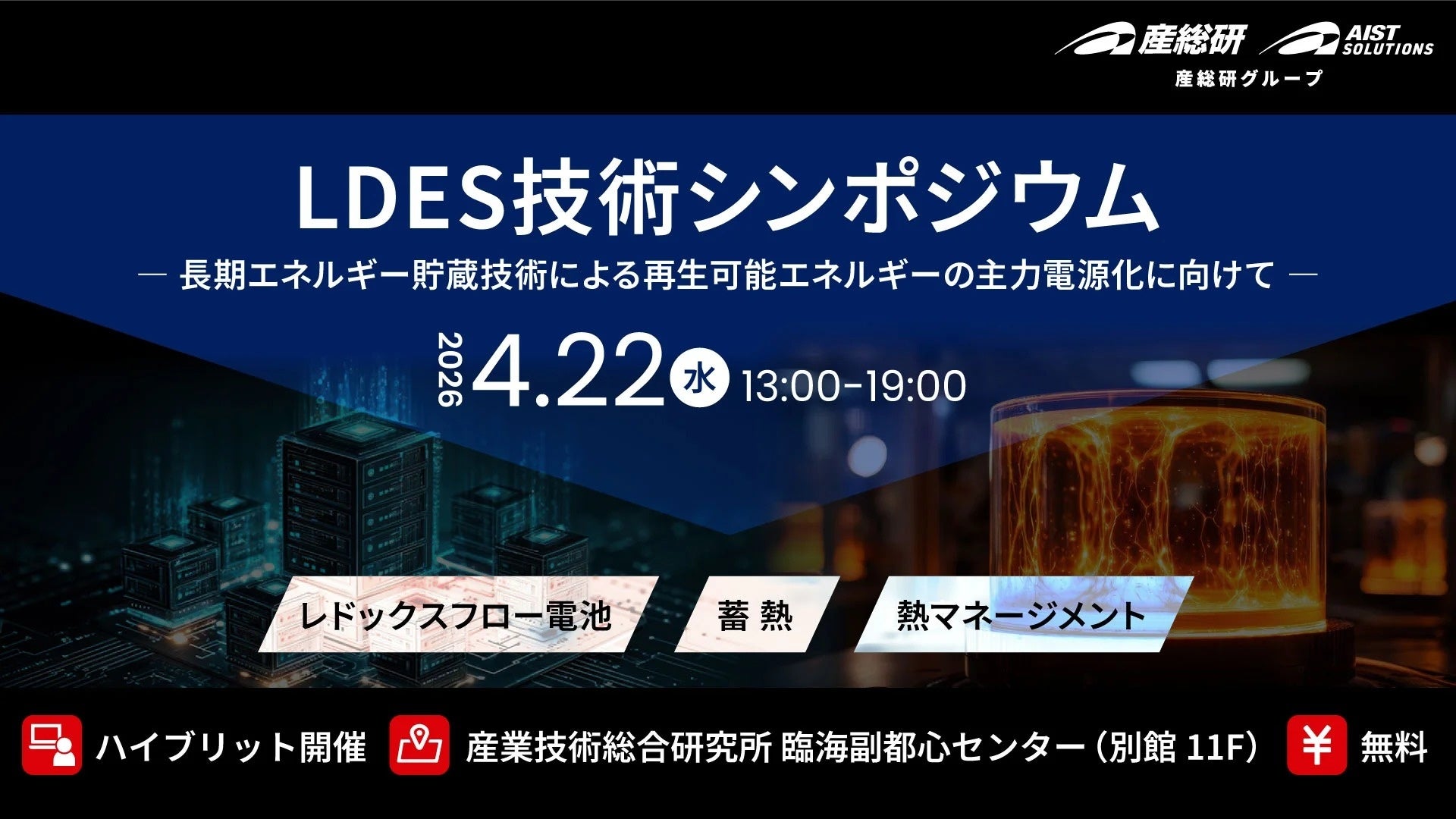 (産総研グループ/無料セミナー)LDES技術シンポジウム ―長期エネルギー貯蔵技術(LDES)による再生可能エネルギーの主力電源化に向けて―【4/22 東京お台場・ハイブリッド開催】