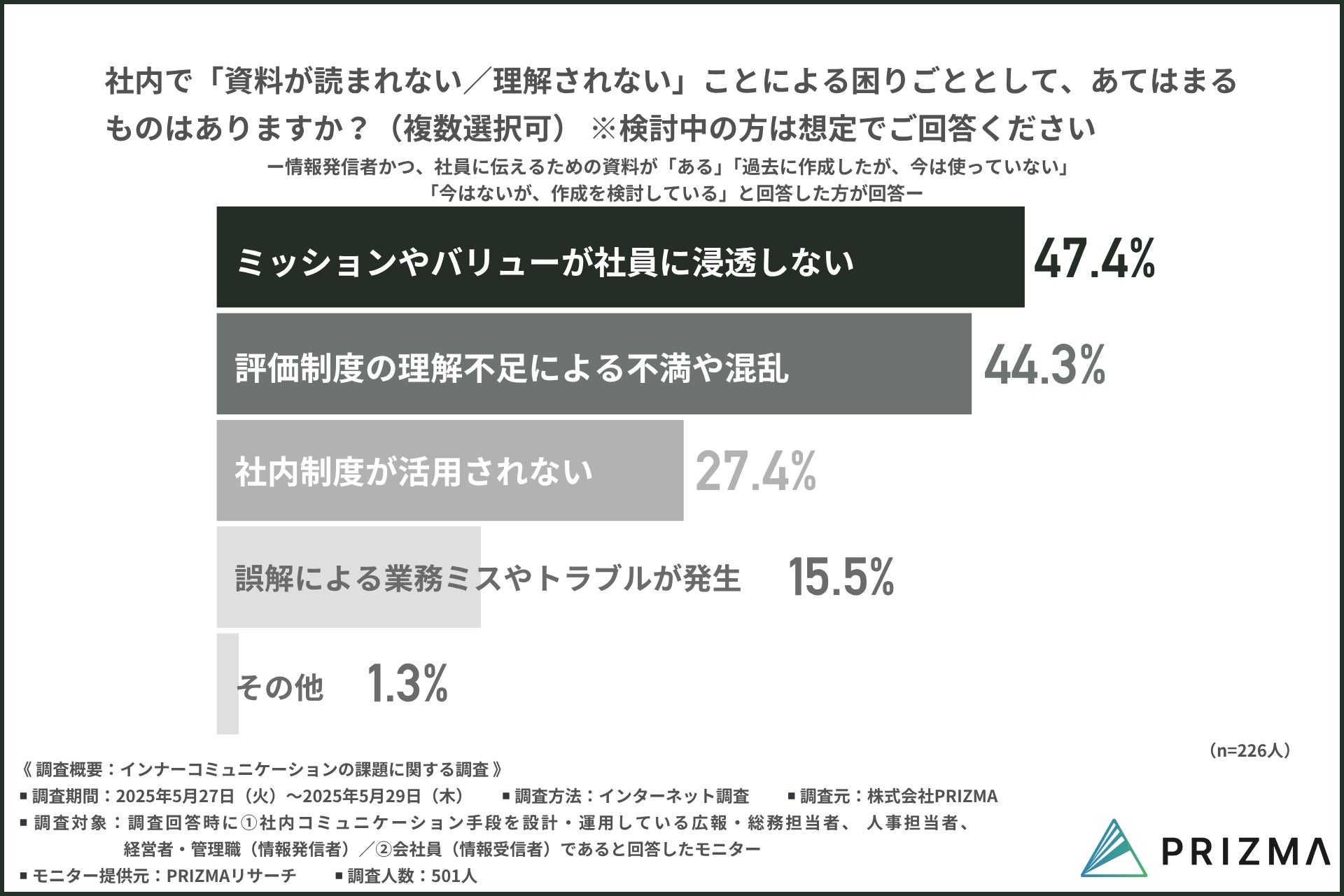資料が読まれないことによって生じている困りごととして「社内で「資料が読まれない/理解されない」ことによる困りごととして、あてはまるものはありますか?」と尋ねたところ、『ミッションやバリューが社員に浸透しない(47.4%)』『評価制度の理解不足による不満や混乱(44.3%)』『社内制度が活用されない(27.4%)』『誤解による業務ミスやトラブルが発生(15.5%)』が挙げられました。