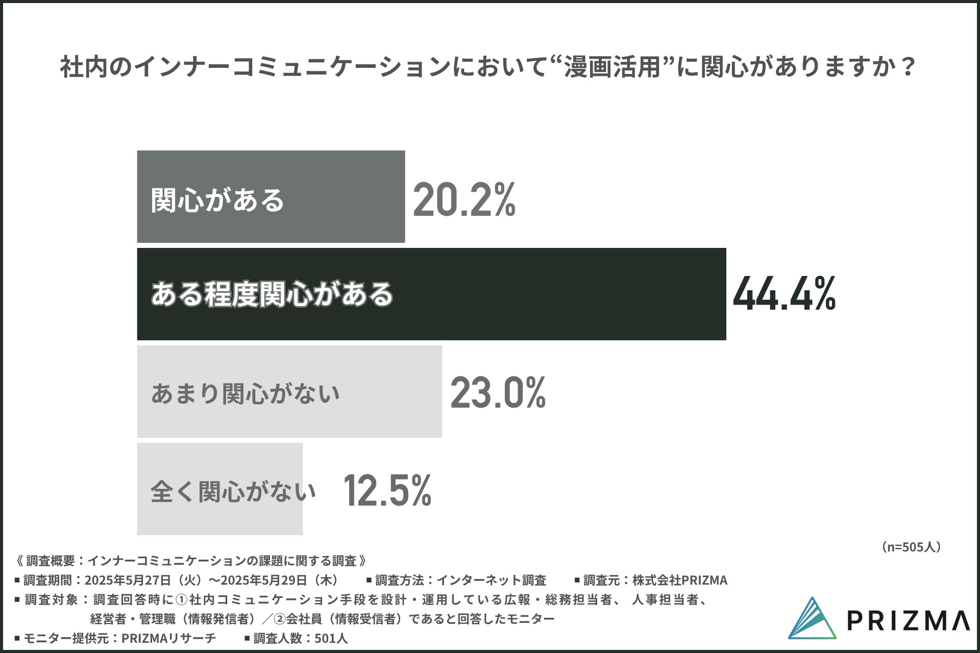 最後に、「社内のインナーコミュニケーションにおいて“漫画活用”に関心があるか」と尋ねたところ、『関心がある(20.2%)』『ある程度関心がある(44.4%)』を合わせて64.6%が肯定的な関心を示しました。