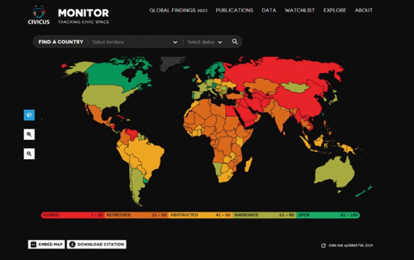 世界の市民社会スペースの動向を調査している国際 NGO、 CIVICUS は、毎年、CIVICUS Monitorとして、その調査結果を報告しています。