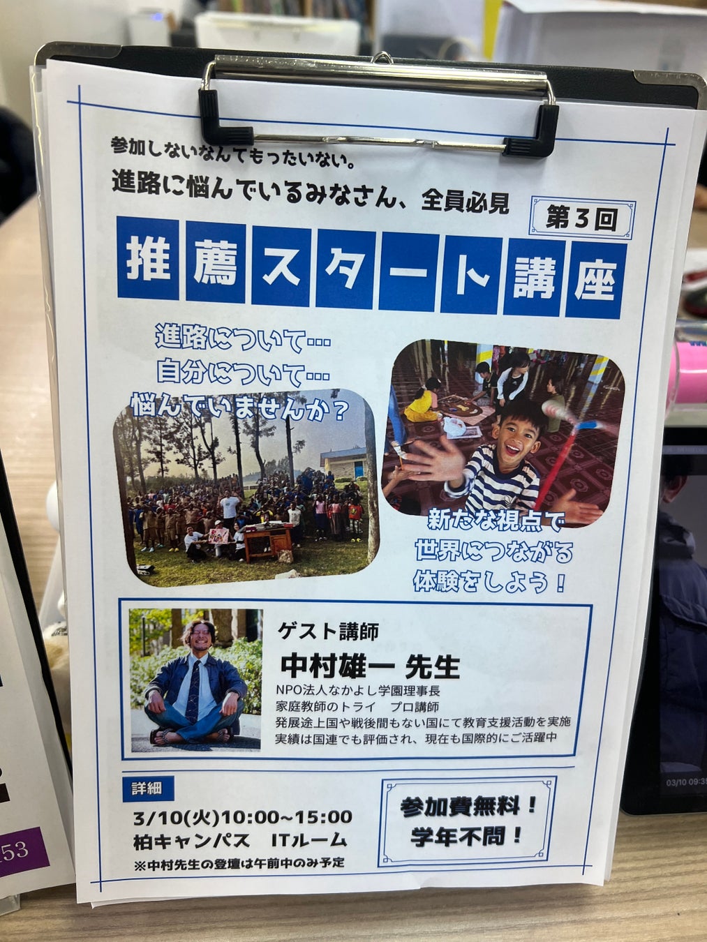 講師を務めた中村雄一は、家庭教師のトライのプロ講師として教育現場に関わる一方、NPO法人なかよし学園プロジェクト代表として、アフリカや中東など世界各地で教育支援や平和教育活動を行っています。講演では、紛争地域や貧困地域の教育現場での授業の様子や、日本の学校と世界の子どもたちが学びでつながる取り組みが紹介されました。