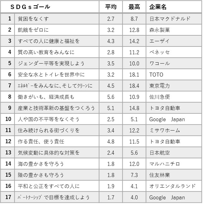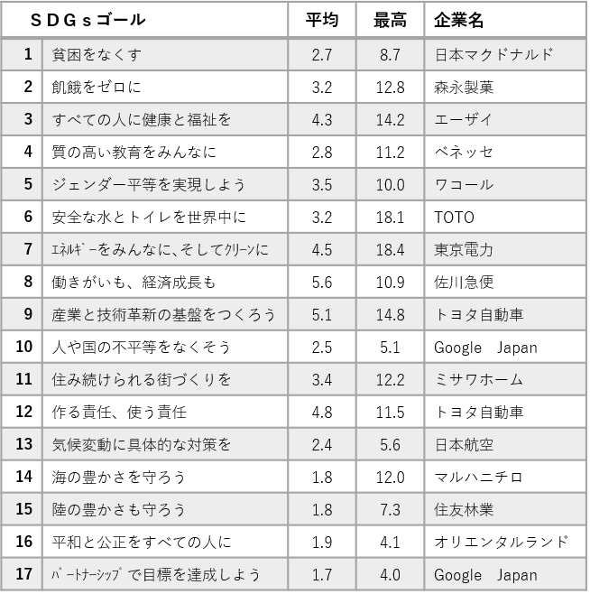 各社の取り組みをSDGsの17ゴール別に評価してもらった結果から、290社の平均と、ゴール別に最も評価が高かった企業名とその値を表にまとめた。