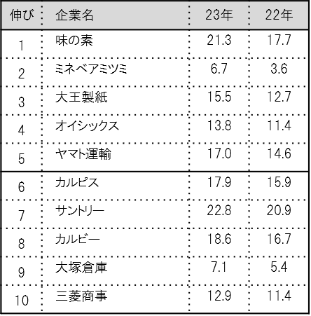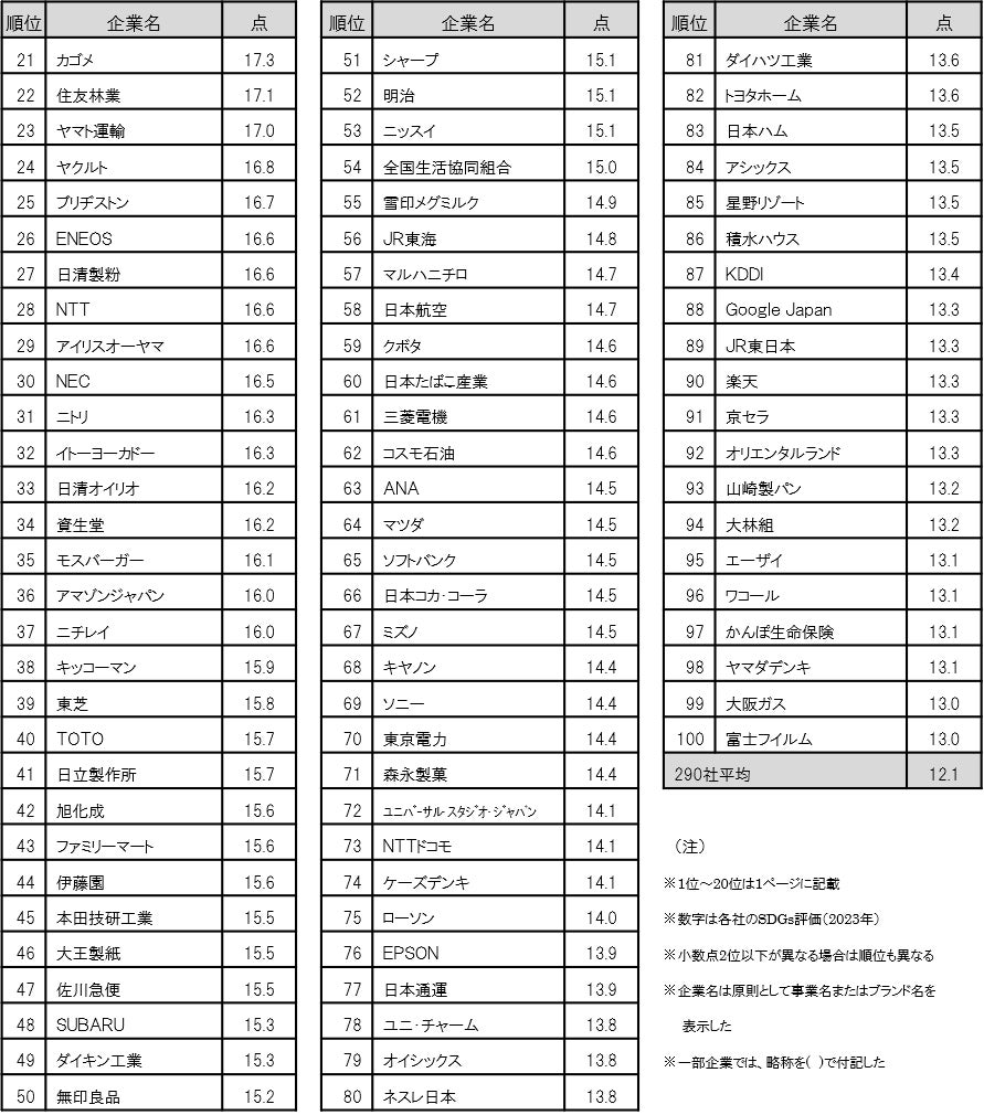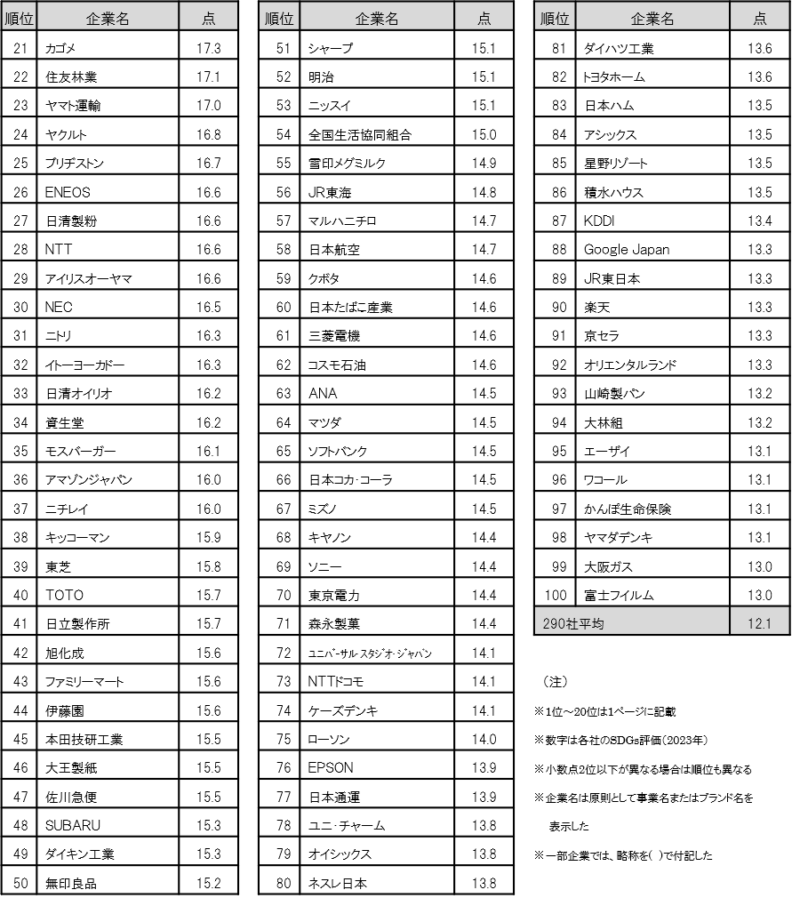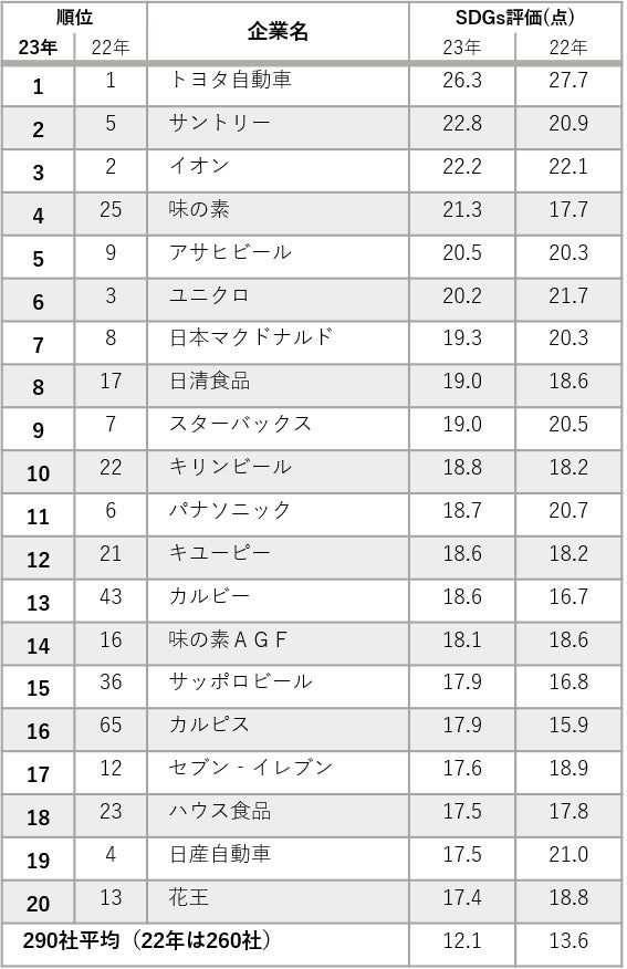 2位はサントリーで前年の5位から3つランクを上げた。「本格的に取り組んでいる」との回答が14.3%と前年より1.5ポイント増加し、SDGs評価は22.8点と前年より1.9点の上昇となった。4位は味の素で21.3点。同社は前年の17.7点より3.6点増と、290社の中で最も伸びが大きく、「取り組んでいない」と否定的な回答はわずか4.4%と少ない。味の素スタジアムで「ごみ拾いはスポーツだ!」などのイベントを行うなど、消費者参加型の取り組みを積極的に展開している。