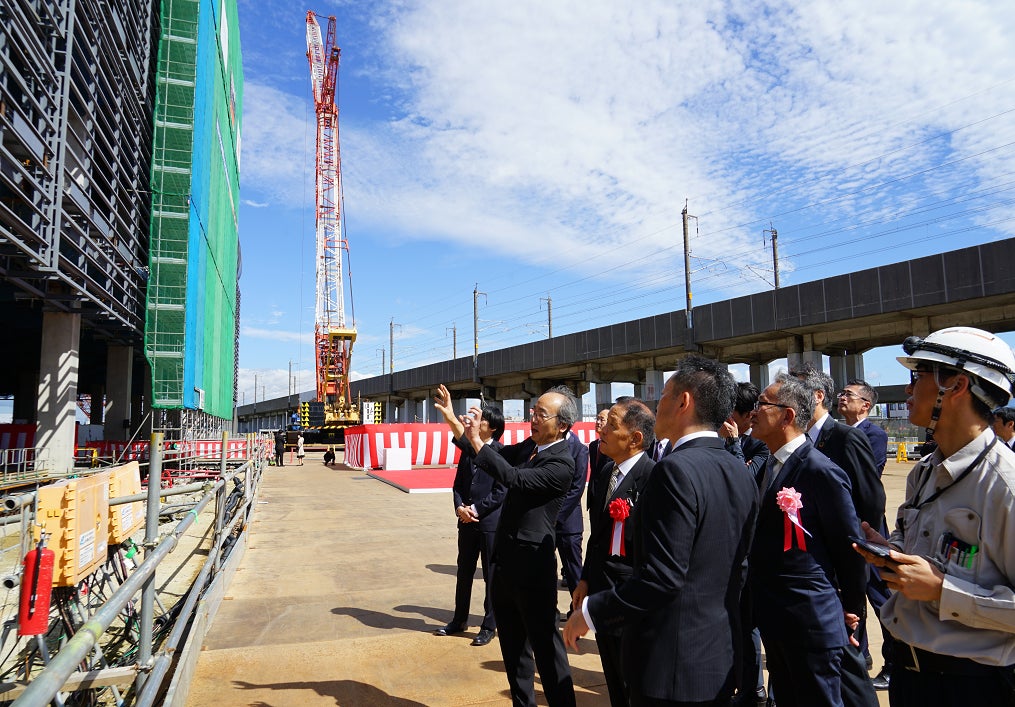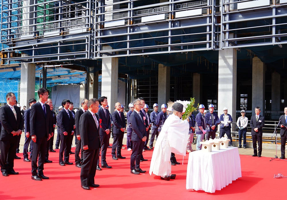 上棟式には、設計をご担当いただく、株式会社日建設計の常務執行役員 クライアントリレーション部門統括 佐藤 健様、施工をご担当いただく鹿島建設株式会社の執行役員 北陸支店長 木村 淳二様らとともに、トラスコ中山株式会社の代表取締役社長 中山 哲也が参加し、上棟の儀や玉串奉奠(ほうてん)などの儀式を滞りなく執り行いました。