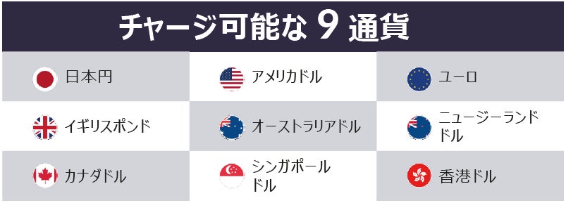 日本円はもちろんのこと、海外出張や海外留学に人気渡航先の通貨、アメリカドル、ユーロやオーストラリアドルを含む8通貨で、外貨建てチャージが可能です。