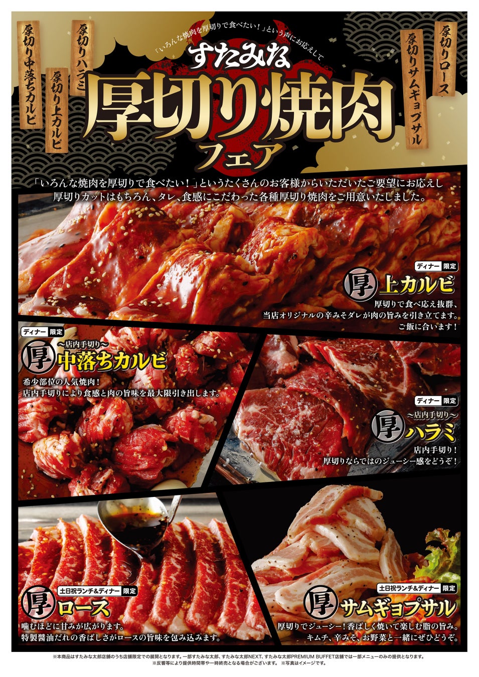 下記一部すたみな太郎店舗では、厚切りロース(土日祝ランチ&ディナー)、厚切り上カルビ(ディナー)、厚切りハラミ(ディナー)のみの提供となります。