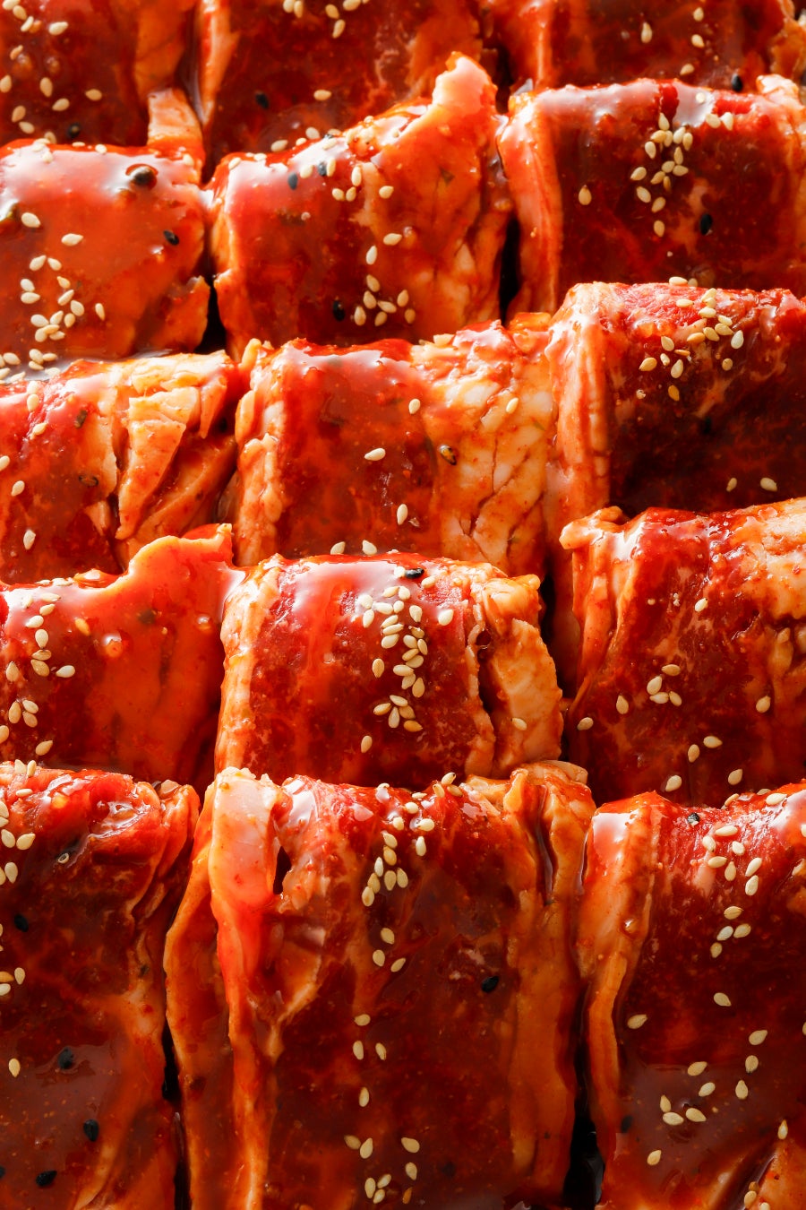 厚切りで食べ応え抜群、当店オリジナルの辛みそダレが肉の旨みを引き立てます。ご飯に合う!