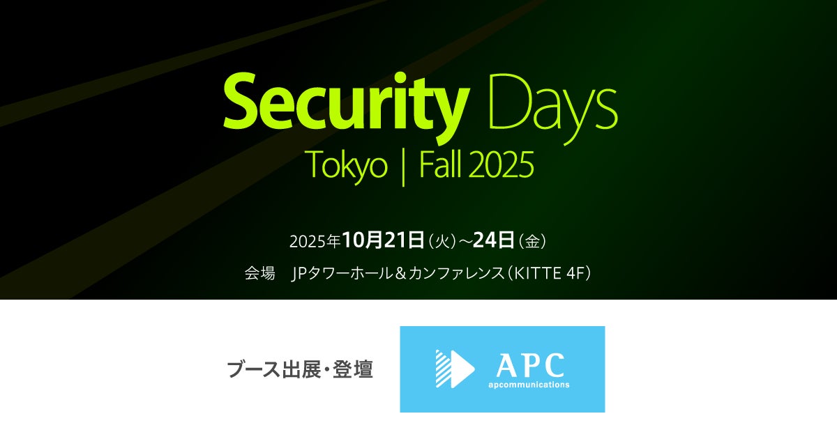 株式会社エーピーコミュニケーションズ(本社:東京都千代田区、代表取締役:内田武志、以下「当社」)は、2025年10月21日(火)〜24日(金)にJPタワーホール&カンファレンス(KITTE 4F)にて開催される、情報セキュリティに関する専門イベント「Security Days Fall 2025 Tokyo」に、セキュリティ対策やIT運用に関するサービスを出展します。