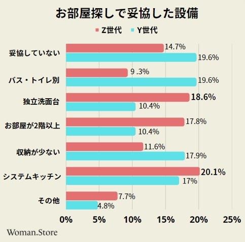 ・Y世代は「バストイレ別」「妥協していない」と回答した割合が多く、Z世代と比較して妥協した設備が大きく異なる結果に。