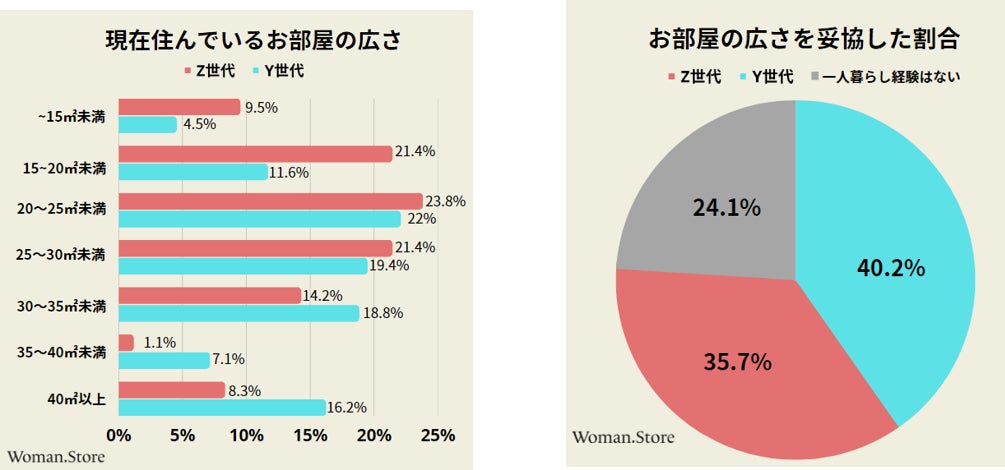 『Woman.Store』(https://store.woman.chintai/)で実施した、お部屋探しに関するアンケートではZ世代とY世代(※1)の女性に分けて結果を分析。「お部屋の広さ」「お部屋探しの際に妥協した家賃幅」「妥協した設備」の3つの項目に分けてお伝えします。