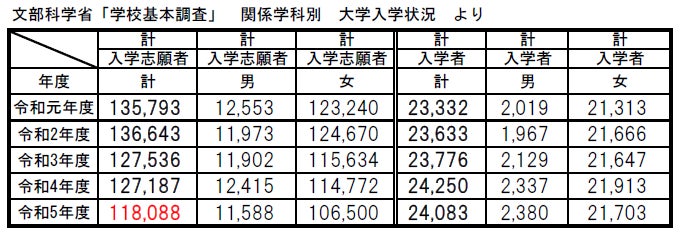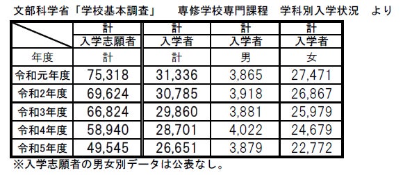 従来の看護専門学校進学層が大学に流れているとしても、そちらの減少に歯止めをかけるだけで看護師養成施設全体の志望者は減少しているといえる。実際に同調査によれば令和5年度の専門学校看護分野の入学者は令和元年度と比較すると15.0%減少している(※下表参照)。また、志願者数でみると34.2%も減少している。AO、推薦入試での入学者の増加も反映しているものと考えられ、一概に判断はできないが入学者の学力の低下も懸念され始めている。