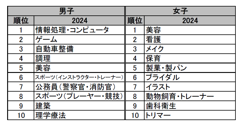 ★女子3位であった「保育」は「メイク」にその位置を譲り、2年連続で4位となっている。