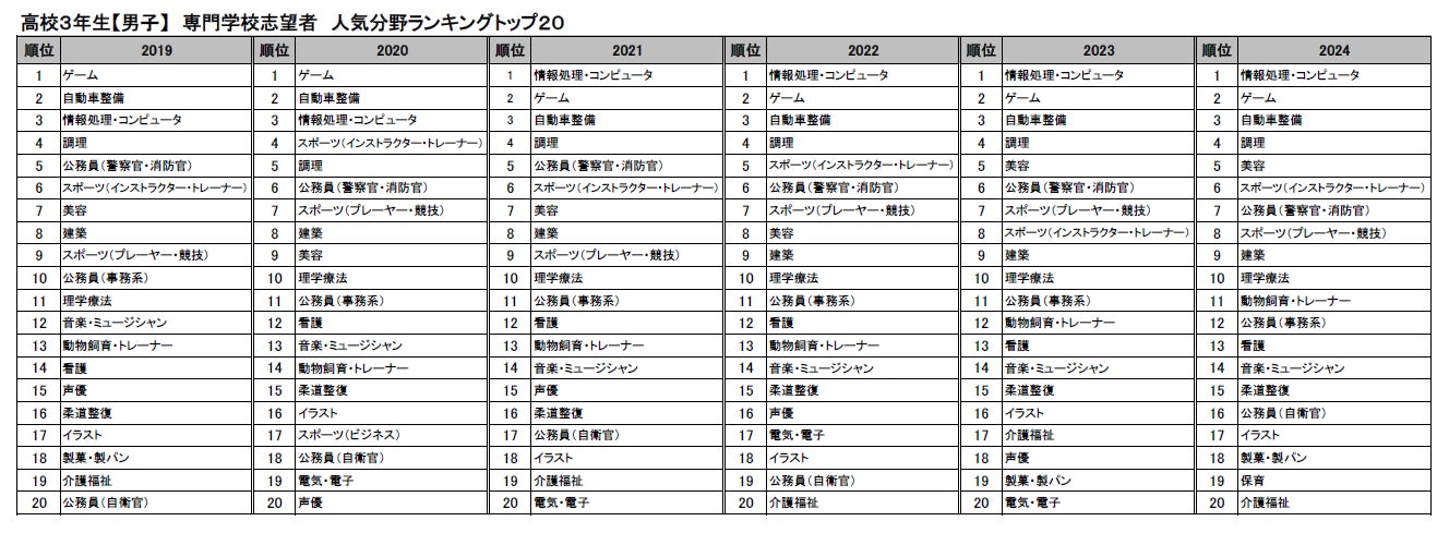 専門学校の学科の中では珍しい職業や資格に直結していない「声優」はかつて人気が高く、全国の専門学校で学科の新設ラッシュがあった分野だが、男子は2019年の15位から2024年23位に、女子は14位から22位にまで低下している。そうした流れを反映してか、近年一部の専門学校では声優養成学科を動画配信者養成系の学科に再編する動きがみられる。