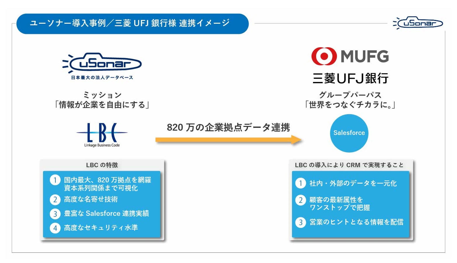 ユーソナー株式会社(本社:東京都新宿区、代表取締役会長:福富 七海、代表取締役社長:長竹 克仁、以下ユーソナー)は、株式会社三菱UFJ銀行(本店:東京都千代田区、取締役頭取執行役員:半沢 淳一、以下三菱UFJ銀行)に、顧客データ統合ソリューション「uSonar」を導入いただきましたのでお知らせします。三菱UFJ銀行の中期経営計画が掲げる7つの成長戦略のひとつ「法人✕WMビジネス強化」推進において、ユーソナーが保有する国内最大※1の企業データベースの網羅性や名寄せ技術が評価されました。企業におけるDX推進やデータドリブン経営が進むなか、顧客データの正確性や最新性をどう保つかは金融業界においても重要テーマとなっており、ユーソナーはこの領域での支援に注力してまいります。