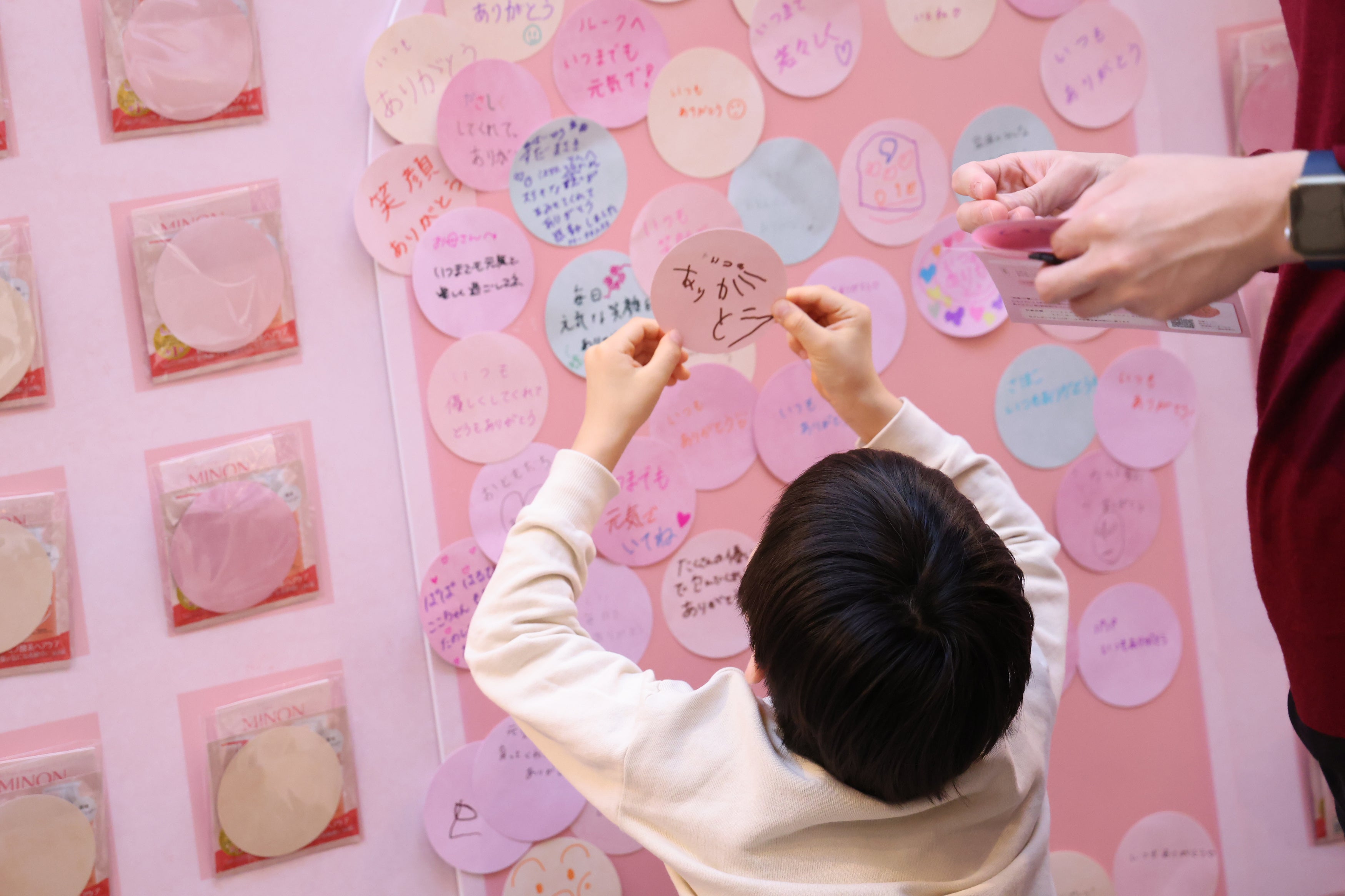 「-あなたの肌に寄り添う-ミノンひろば@横浜」の会場では、ミノンの肌へのこだわりやプロジェクトの想い、ブランドや製品の魅力について、親子で楽しみながら知っていただける様々なコンテンツをご用意。ミノンや肌にまつわるクイズを通じてブランドを知ってもらう「ミノンクイズ」。また、会場中央には巨大なミノンボトルのメッセージボードを設置。プロジェクト名の「やさしさ」や「エール」にちなんで、ご来場いただいた皆さまに大切な人へのメッセージをその場で書いてボードに貼っていただき、たくさんの方のやさしさが詰まった世界に一つのメッセージボードをつくりあげました。さらに、参加いただいた方の中から抽選でミノン製品つめあわせなどが当たる抽選を実施。より多くの方にミノンブランドについてふれていただく機会となりました。