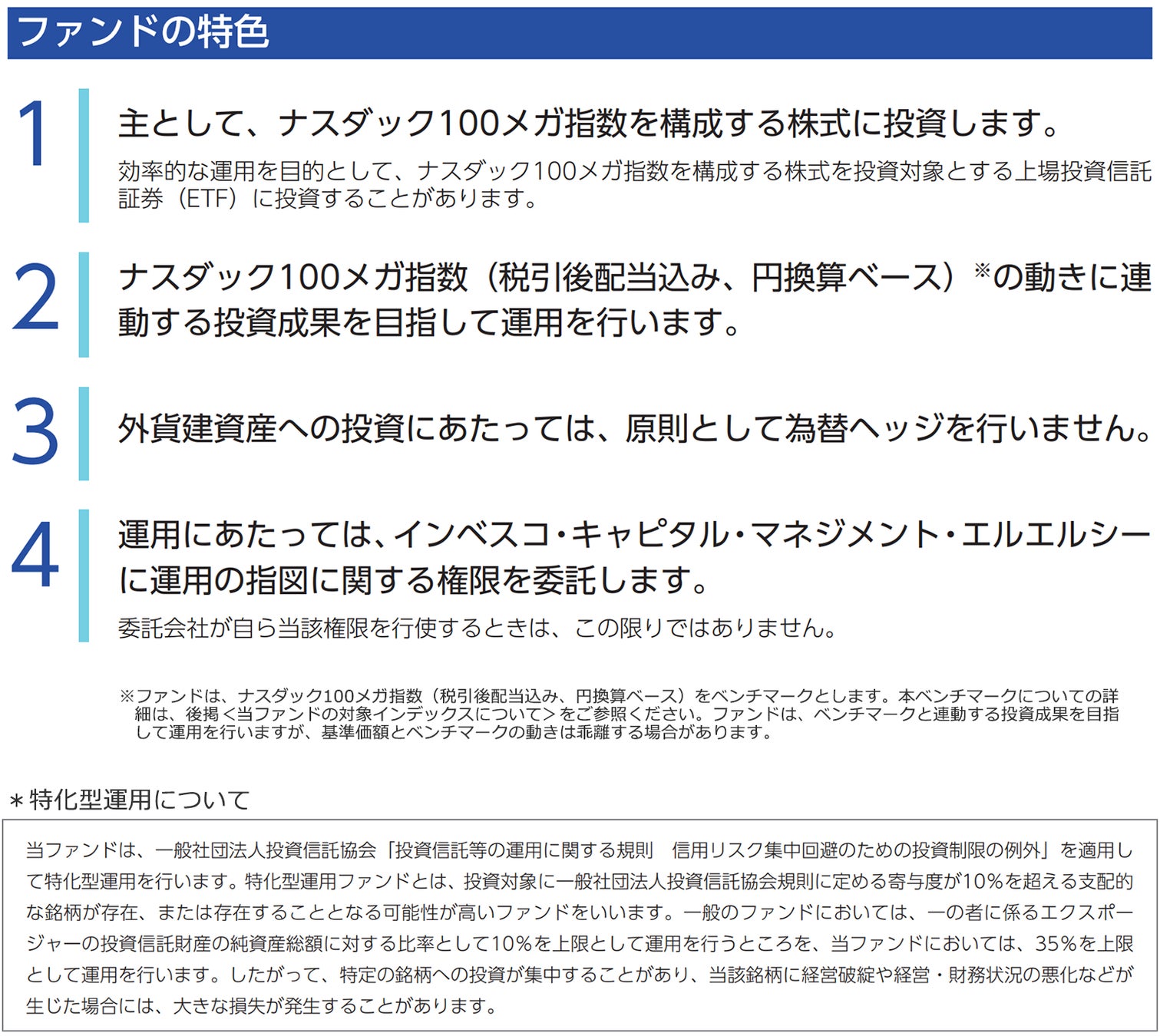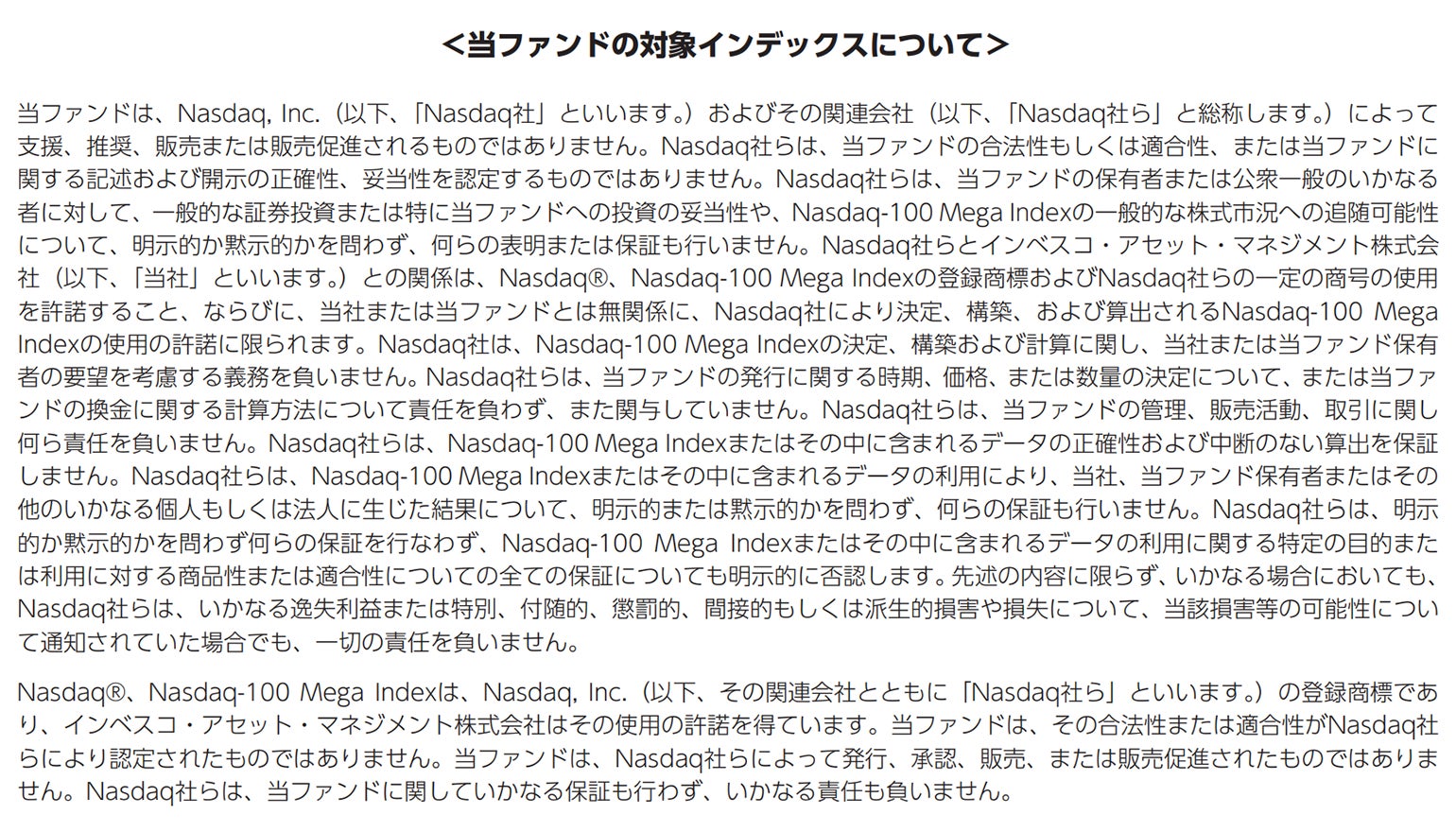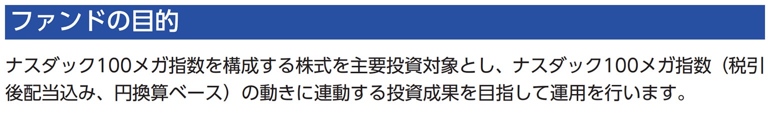 当ファンドはナスダック100メガ指数を構成する株式を主要投資対象とし、ナスダック100メガ指数(税引後配当込み、円換算ベース)の動きに連動する投資成果を目指して運用を行います。(当ファンドは、特化型運用を行います。*)