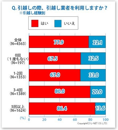 引越し経験を尋ねたところ、全体の95.7%が経験者。更に、全体の27.5%の人が「6回以上」の引越しを経験しているという結果になりました。続いて、引越しの際に業者を利用するかどうかを尋ねました。引越しに「業者を利用する」と回答した割合は77.9%。引越し経験回数が多いほど、この割合は高くなる傾向がみられました。